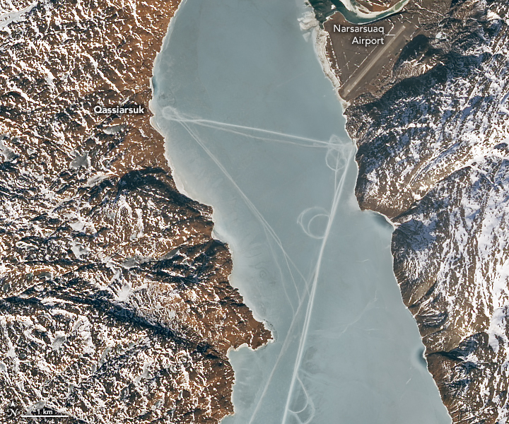 Traversing the frozen fjord with a vehicle would make sense given its size. The track that connects the small towns of Qassiarsuk and Narsarsuaq, visible in the first detailed image above, spans about 4 kilometers (2.5 miles). The track that runs the length of the fjord is at least 20 kilometers (12 miles) long.