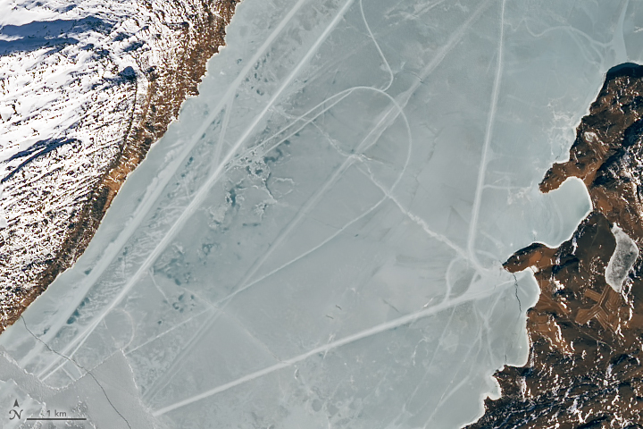 Nathan Kurtz and several other scientists in the Cryospheric Sciences Laboratory at NASA’s Goddard Space Flight Center reviewed the images. Their consensus was that many of the tracks, especially those that include loops, were likely produced by vehicles, such as snowmobiles. “It seems likely that residents from the town or nearby were out on the ice, possibly hunting or traveling,“ Kurtz said.