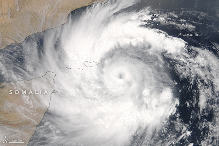 Tropical Cyclone Sagar was the first to hit, making landfall in Somalia on May 19, 2018. On that day, the Moderate Resolution Imaging Spectroradiometer (MODIS) on NASA’s Aqua satellite acquired a natural-color image (above) of the storm. Maximum sustained winds reached 55 knots (65 miles or 100 kilometers per hour)—the equivalent of a tropical storm on the Saffir-Simpson scale. The storm delivered more than a year’s worth of rain to parts of the country, which has been coping with years of drought. According to Reliefweb, damage from Sagar’s floodwaters and wind displaced hundreds of thousands of people.