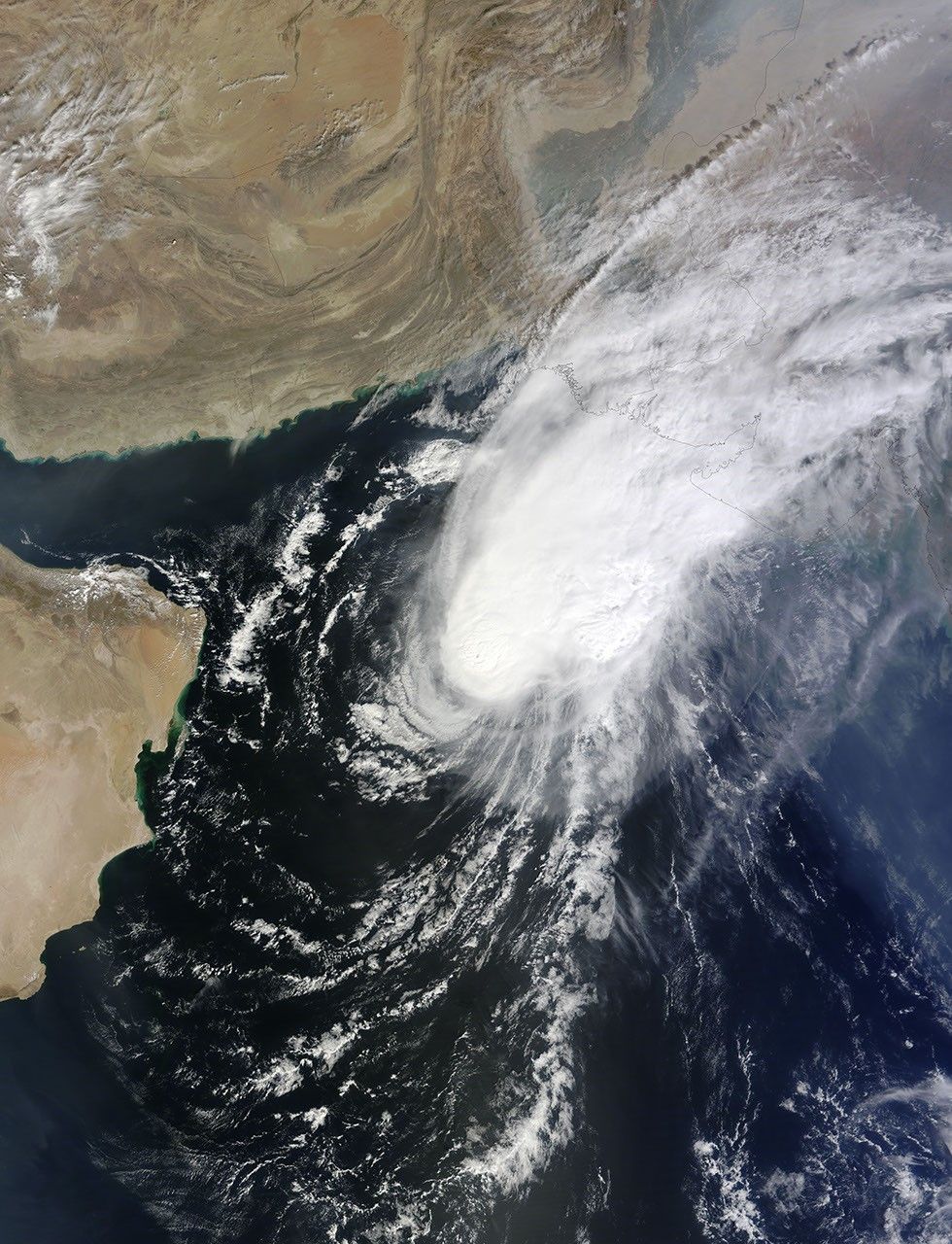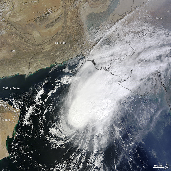 The images above and below were acquired by the Moderate Resolution Imaging Spectroradiometer (MODIS) on NASA’s Terra satellite on October 28 (top), when the storm was approaching peak intensity, and on October 30 (below), when it had decayed to tropical storm force. A few hours after the first image was taken, Nilofar’s winds reached 115 knots (130 miles or 210 kilometers per hour). It was the third strongest cyclone on record for the Arabian Sea. By the time the second image was acquired, wind speeds had dropped to 50 knots (55 mph or 90 kmph).