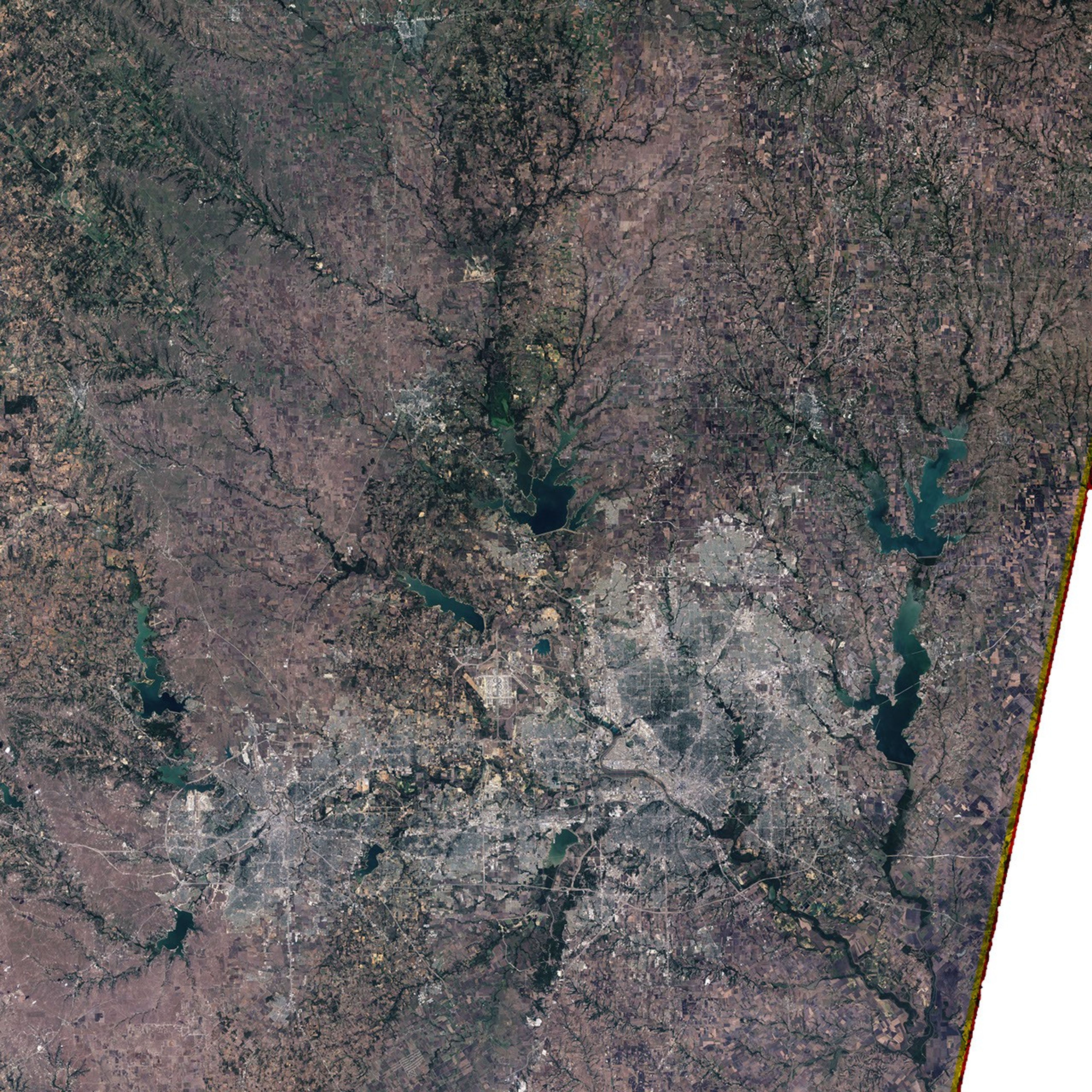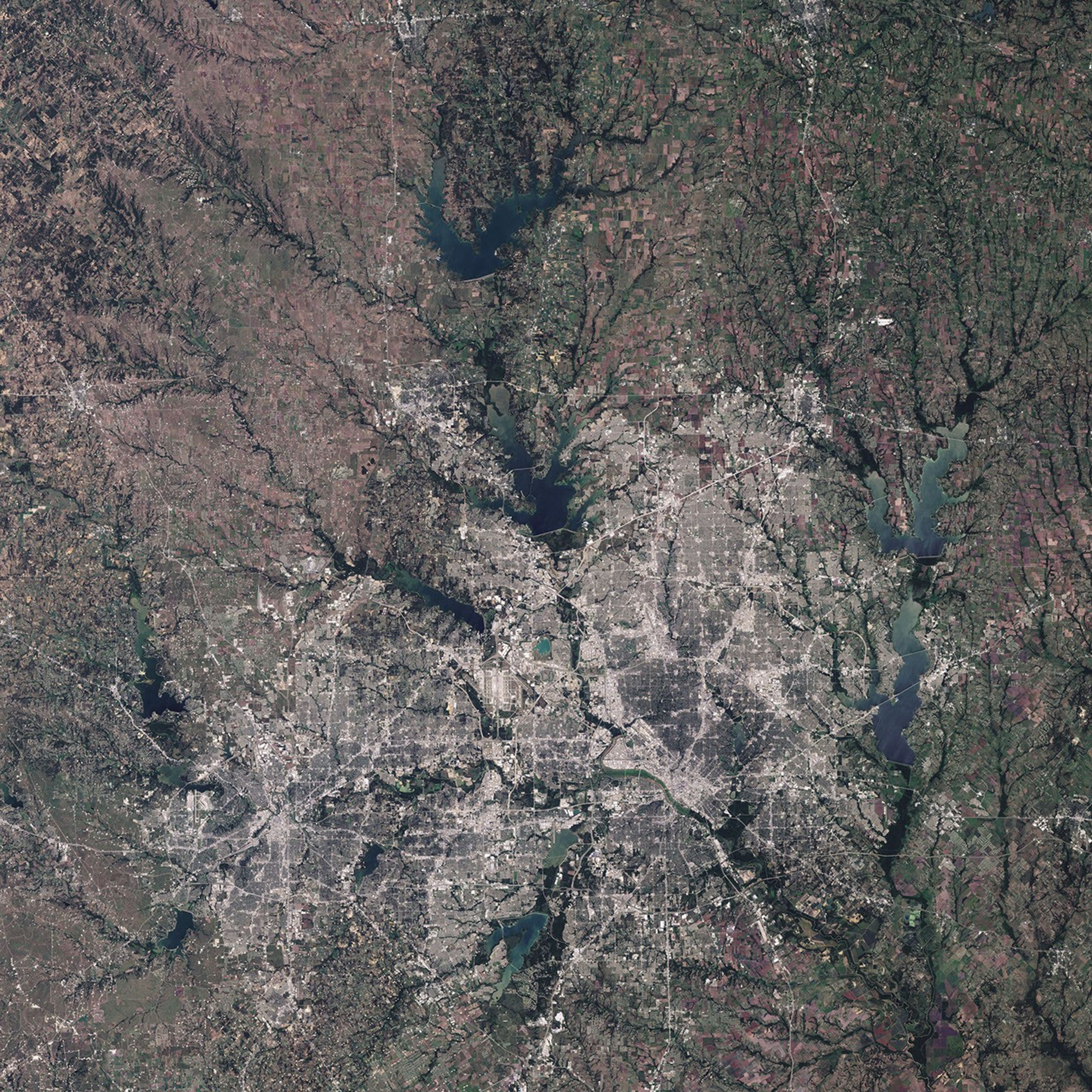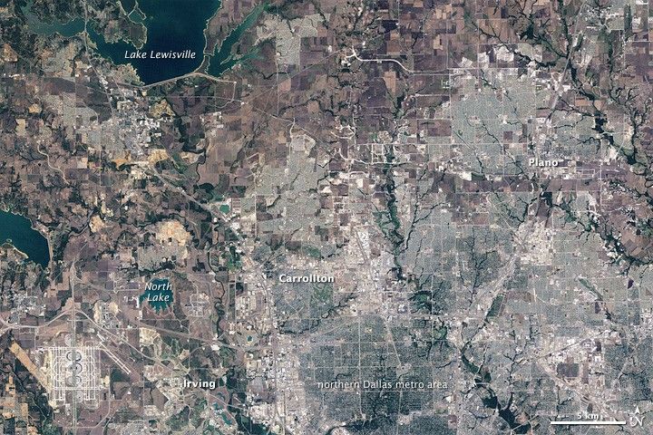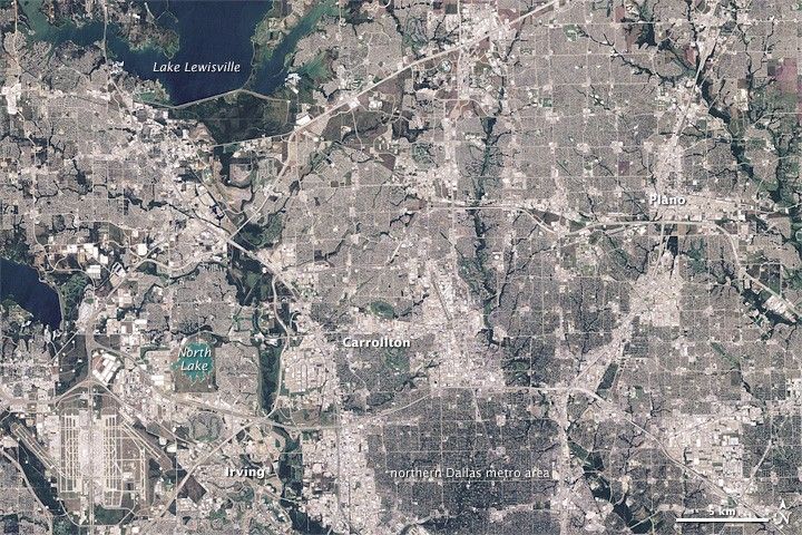 NASA’s Landsat 5 satellite captured these images of three boomburbs—Irving, Carrollton, and Plano—along the northeastern margin of the Dallas Metropolitan area. Between August 31, 1984 (top), and August 4, 2009 (bottom), each of these suburbs grew explosively, filling in the patchwork of agricultural lands to the north and west of Dallas. Irving expanded westward to the Dallas-Fort Worth airport and northward to North Lake. Carrollton grew northwest toward Lake Lewisville, while Plano completely filled the territory between two tree-lined creeks.
