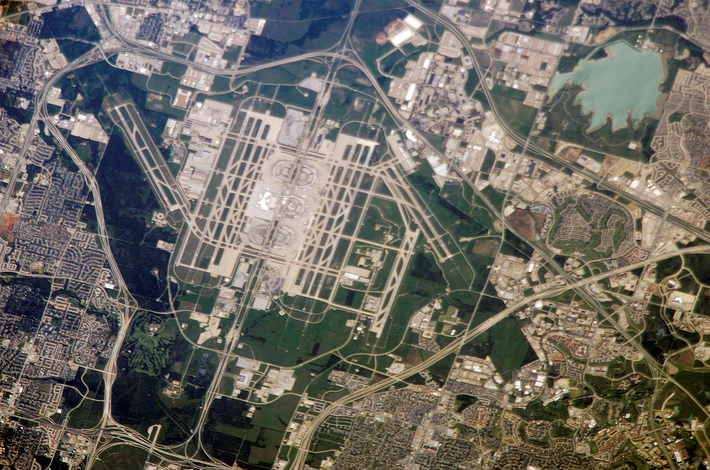 This oblique astronaut photograph (oblique means the viewing angle is not vertical relative to the Earth’s surface beneath the International Space Station) captures the entire airport and portions of the surrounding Dallas-Fort Worth metropolitan area. The white rooftops of the new International Terminal D (completed in 2005) are also distinct from less reflective rooftops of the older terminals. A sense of the size of the airport is provided by the approximately 2,800-meter-long, northwest-southeast runway to the west of Terminal D (2,800 meters is about 1.7 miles). The oblique viewing angle also accentuates light reflection off of North Lake (upper right), giving the water surface a grey-green cast.
