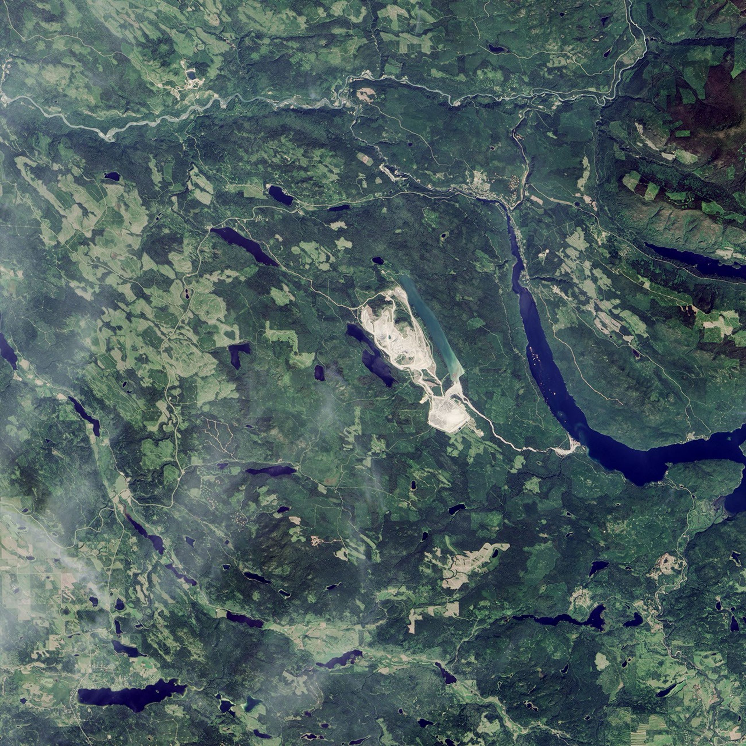 On August 5, nearly all of the wastewater in the retention basin had drained, exposing the silty bottom. Hazeltine Creek, normally about 1 meter (3 feet) wide, swelled to a width of 150 meters (490 feet) as a result of the spill. In the aftermath of the flood, a layer of brown sediment coated forests and stream valleys affected by the spill. Notice how much forest immediately north of the retention basin was leveled. Debris, mainly downed trees, are visible floating on Quesnel Lake. (Note that some of the variations in colors between the two images are caused by different lighting conditions and viewing angles.)