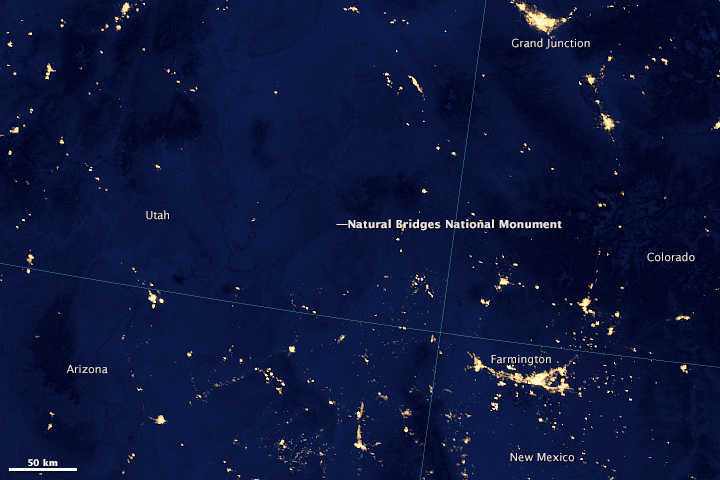 The western U.S. also has brightly lit cities, but vast expanses of darkness are more common. The third image pinpoints the location of Utah's Natural Bridges National Monument, a national park that in 2007 was the first area to be designated an IDA dark sky park. According to the National Park Service, Natural Bridges has one of the darkest skies in the country. In some areas of the darkest national parks, visitors can see up to 15,000 stars in a night compared to less than 500 in some urban environments.