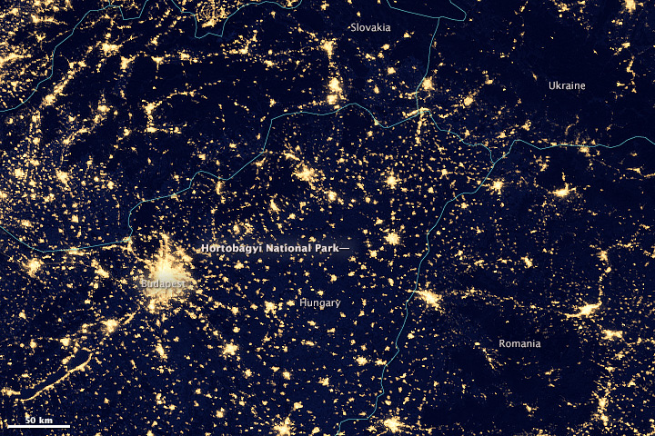 Europe also has a network of bright city lights, as shown in the fourth image. The box denotes the region of Hungary detailed in the fifth image. Hortobágyi (Hortobágy) National Park, located about 150 kilometers (90 miles) from Budapest, is a UNESCO World Heritage site known for vast plains and wetlands. It is also an IDA silver-tier park, where brighter sky phenomena are regularly visible, and fainter ones are sometimes visible. The Milky Way, for example, must be visible in summer and winter.