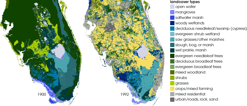 Steyaert based the modern land cover map on satellite data collected in the early 1990s by the Thematic Mapper sensor on NASA’s Landsat 5 satellite. As a first step, Steyaert used the USGS National Land Cover Dataset developed from 1992-93 Landsat scenes. To get additional detail on the types of wetlands, he added land cover data based on Landsat scenes from 1993-94, which were produced by the “Florida GAP” project.