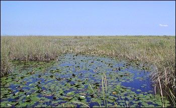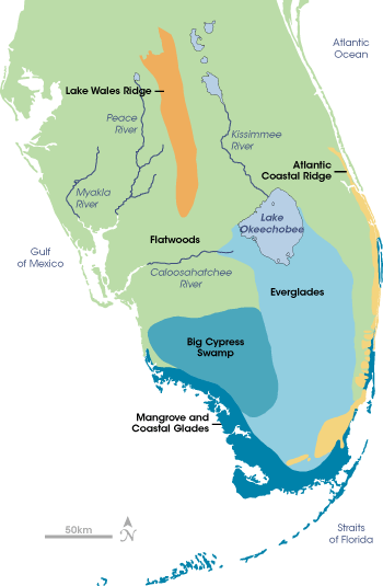 Runoff from the north kept the Kissimmee River Floodplain in the central part of the peninsula almost perpetually under water. From there the water flowed south into Lake Okeechobee. The spillover from the lake glided slowly over the Everglades in a slow-moving, horizontal sheet. Today's flow is dramatically reduced, and the Everglades are only about half the size they once were.