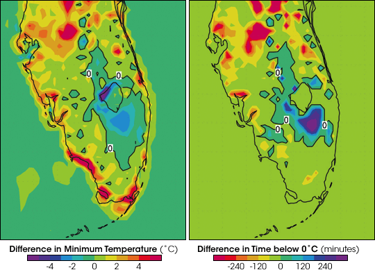 The team reviewed the historical record of severe freeze impacts on the Florida citrus industry and pulled together a second experiment to answer the question. Using their pre-1900 and present-day land cover data, they created a series of paired comparisons of the modeled weather at the time of three damaging freezes: December 26, 1983; December 25, 1989; and January 19, 1997. According to the model results, the southward creep of the winter freeze line was neither a fluke nor a coincidence. It appeared to be the direct result of moving the farms farther south.