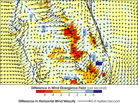 One reason for this, Pielke explains, is the draining of the Kissimmee River Floodplain in the center of the peninsula. In the absence of other large-scale meteorological influences, the afternoon sea breeze determines where, when, and how much it rains in Florida. The sea breeze occurs each day as the Sun heats the land more than it heats the ocean. The air above the land warms and rises, and cooler air from over the Gulf of Mexico and the Atlantic Ocean flows inland.