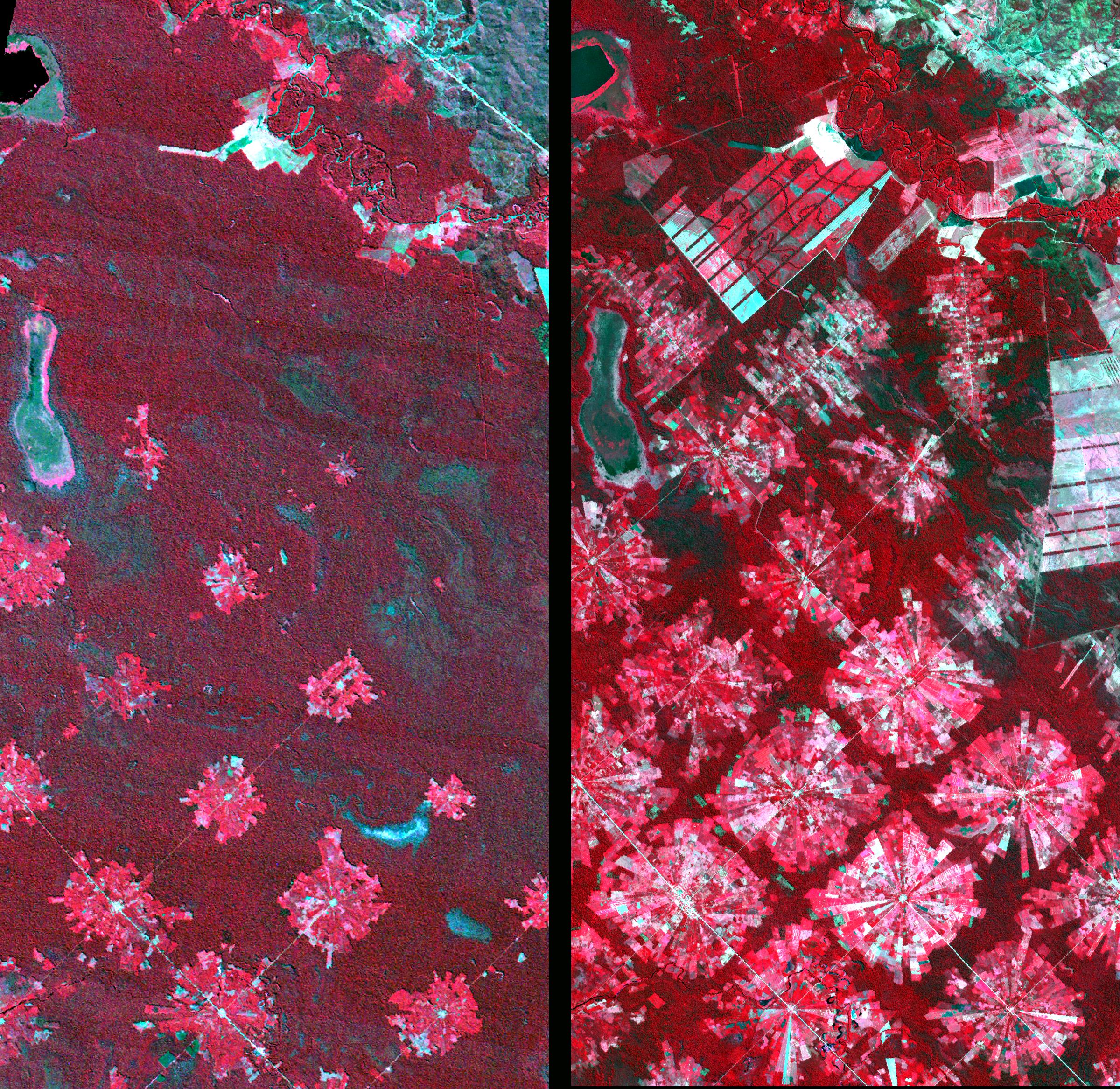 These images from 1986 and 2001 are for an area of tropical dry forest lying east of Santa Cruz de la Sierra, Bolivia. Since the mid-1980s, the resettlement of people from the Altiplano (the Andean high plains) and a large agricultural development effort (the Tierras Baja project) has lead to this area’s deforestation. Soybean production began in earnest in the early 1970s following a substantial increase in the crop’s world price. The pie or radial patterned fields are part of the San Javier resettlement scheme. At the center of each unit is a small community that includes a church, bar/café, school, and soccer field. The rectangular, light colored areas are fields of soybeans cultivated for export, mostly funded by foreign loans. The dark strips running through the fields are windbreaks, which are advantageous because the soils in this area are fine and prone to wind erosion. The 1986 Landsat image (left) was acquired on August 4, 1986, and the ASTER image (right) on August 11, 2001.
