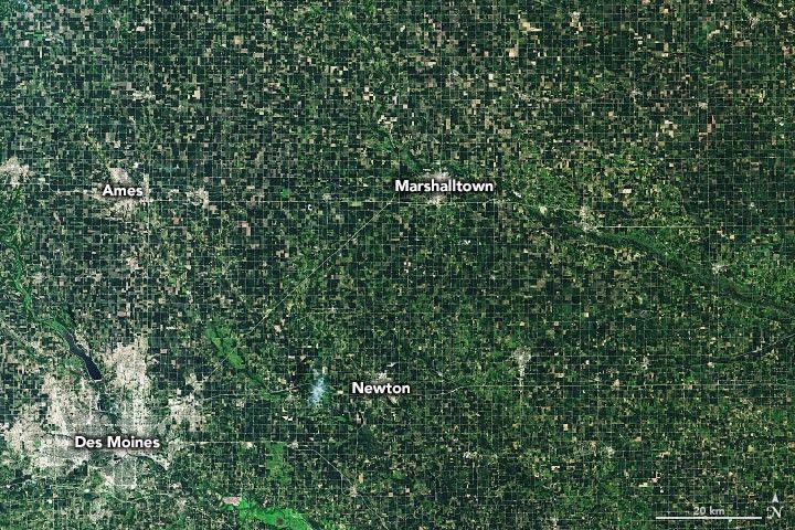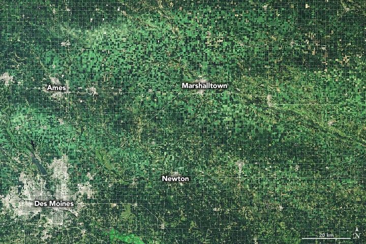 The Operational Land Imager (OLI) on Landsat 8 captured an image of storm-damaged fields around Marshalltown, Iowa, on the day after the storm. For comparison, the second image shows the same area on July 10, 2020. Wind-damaged crops appear light green. Darker areas within the damage swath may be tree breaks or fields where crops took less damage.