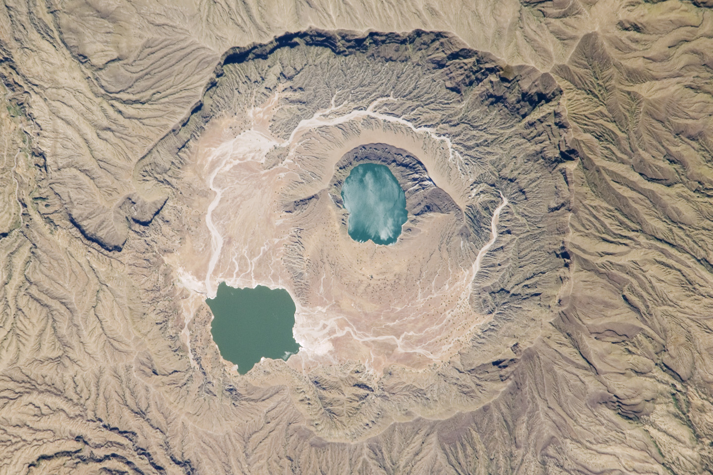 The caldera has the classic circular shape: the depression formed as overlying rock and soil collapsed into the magma chamber after it was emptied by powerful eruptions. Shadows in this astronaut photograph throw the steep southern wall of the outer crater into sharp relief. Following the formation of the main outer crater, a second inner crater (image center) formed, most likely due to later uplift and eruption of fresh magma moving towards the surface. This inner crater is filled with water.