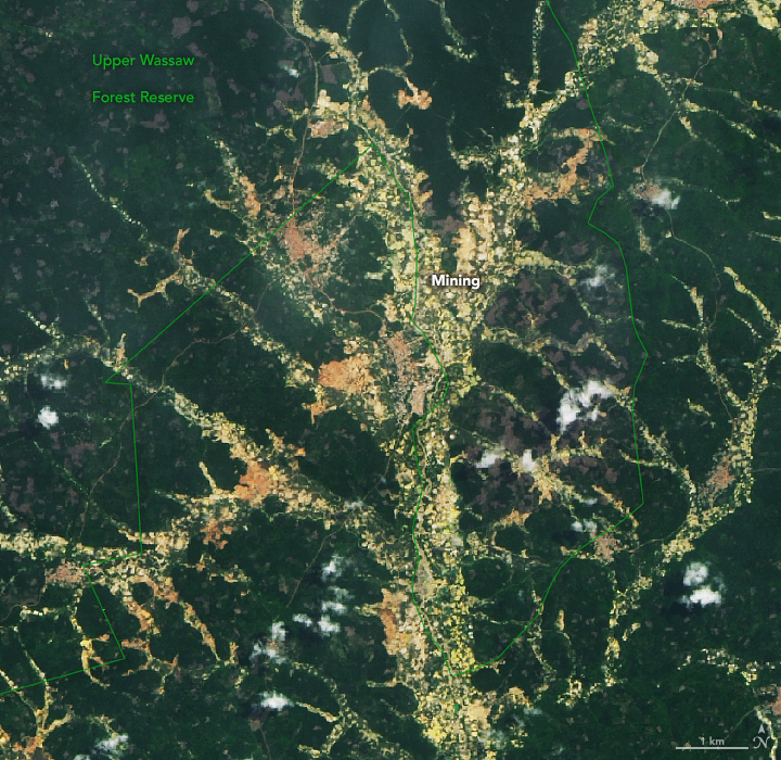 NASA Earth Observatory images by Lauren Dauphin, using Landsat data from the U.S. Geological Survey , protected area data from the World Database on Protected Areas (WDPA) , and mining data from Center for Remote Sensing and Geographic Information Services (CERSGIS) and SERVIR West Africa . Ground photo by Ruth McDowall. Story by Kasha Patel .