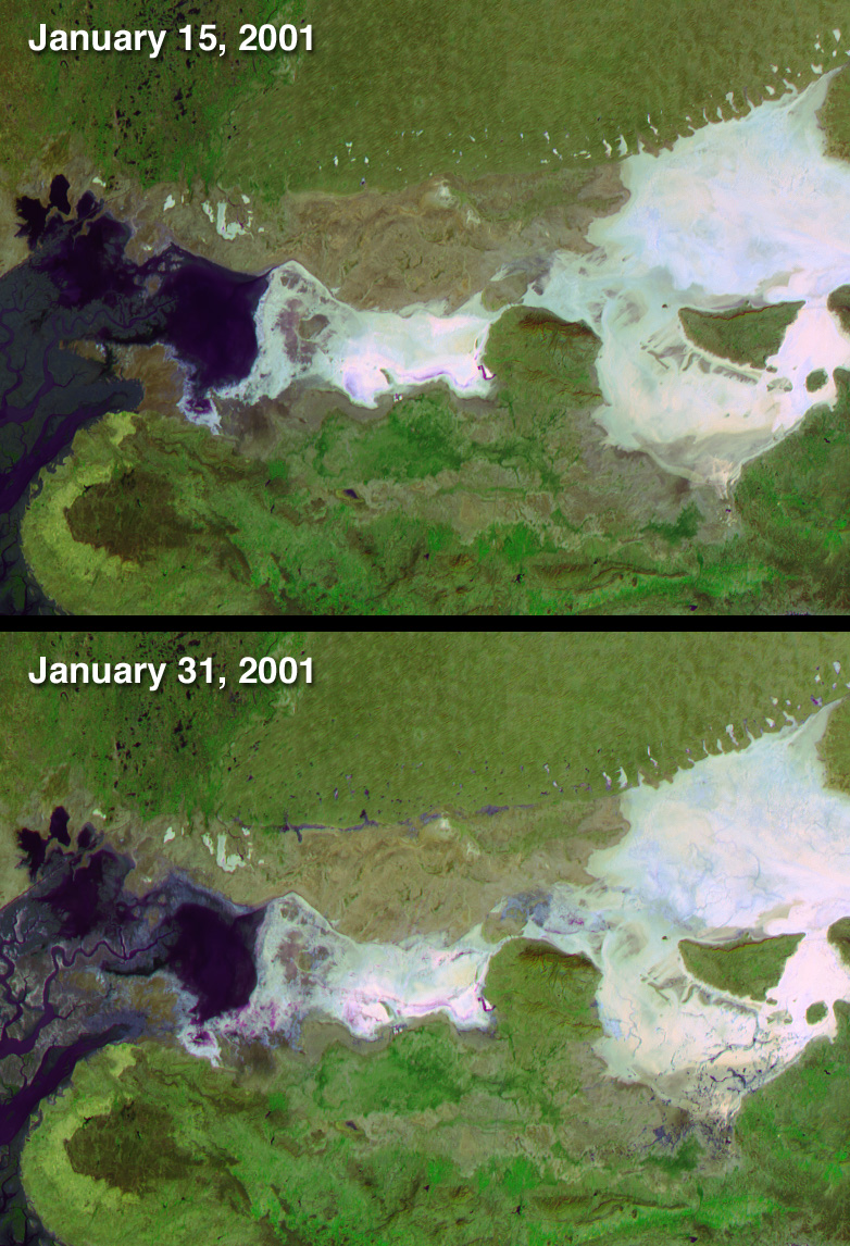 On January 26, 2001, when India’s Republic Day is normallycelebrated, a devastating earthquake hit the state of Gujarat. About20,000 people died and millions were injured throughout the region. Theearthquake had a magnitude of 7.7 on the Richter scale. After theearthquake, local residents reported a mixture of water and sedimentsfountaining from the Earth. These effects, referred to as dewatering,can result from intense ground shaking by strong earthquakes in regionswith shallow water tables. Scientists initially observed dewatering inparts of the Rann of Kutch (a large salt pan in northern Gujarat), andin areas close to the earthquake epicenter. Recent research utilizes theunique capabilities of the Multi-angle Imaging SpectroRadiometer (MISR)instrument to observe earthquake-related dewatering over a broader area(related story: NASA Satellite Helps Scientists See Effects ofEarthquakes in Remote Areas). This research is published in theFebruary 4, 2003, issue of EOS Transactions of the American GeophysicalUnion.