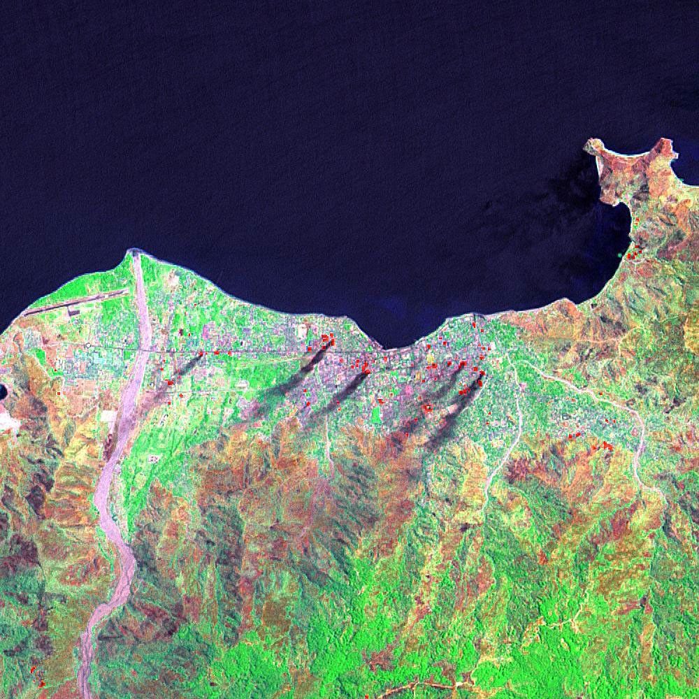 Violence has marked East Timor’s emergence as an independent nation. This false-color Enhanced Thematic Mapper Plus (ETM+) image from Landsat shows parts of the city of Dili, which became the capital of the independent nation of East Timor. The image was captured on September 8, 1999, only a few days after the announcement of the results of the referendum in which the residents of the island voted on whether to remain part of Indonesia or to become an independent nation. The overwhelming support for independence sparked violent protests among dissenters, who set scores of fires (red dots). Dark gray smoke streams southwest from burning buildings in the center of the image.