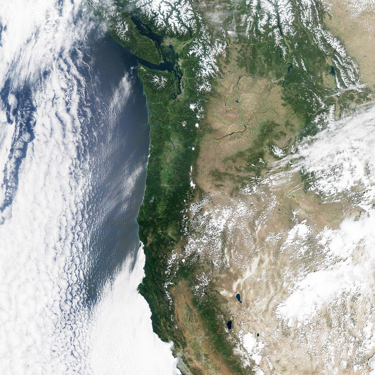 The Moderate Resolution Imaging Spectroradiometer (MODIS) on NASA’s Aqua satellite acquired these natural-color images of Oregon, Washington, and the Cascade and Olympic Mountains. The left image shows the region on May 13, 2014, while the right was acquired on May 3, 2015. Last year was not necessarily good for snowpack, but it was substantially better than 2015.