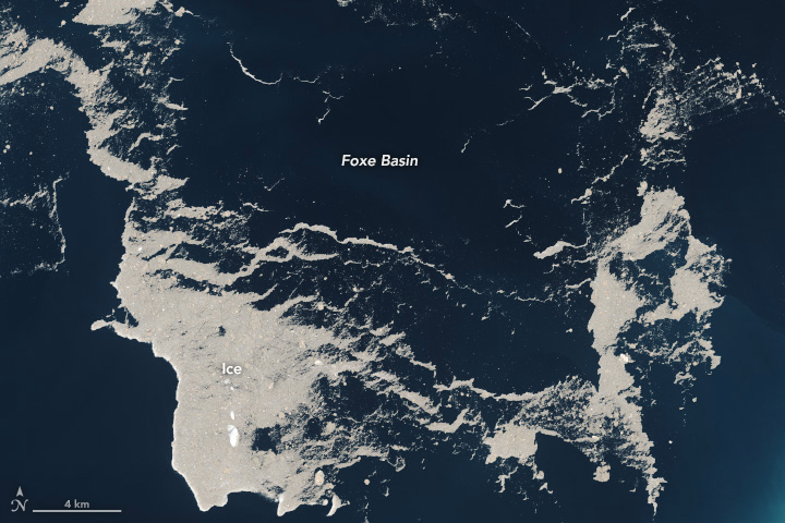 Throughout most of the year, the waters of Foxe Basin are choked with sea ice. By the end of summer, however, open water typically dominates this part of the Canadian Arctic. That was the case when these images were acquired in September 2018, as small patches of ice lingered in the northern reaches of Hudson Bay around Prince Charles Island and Baffin Island.