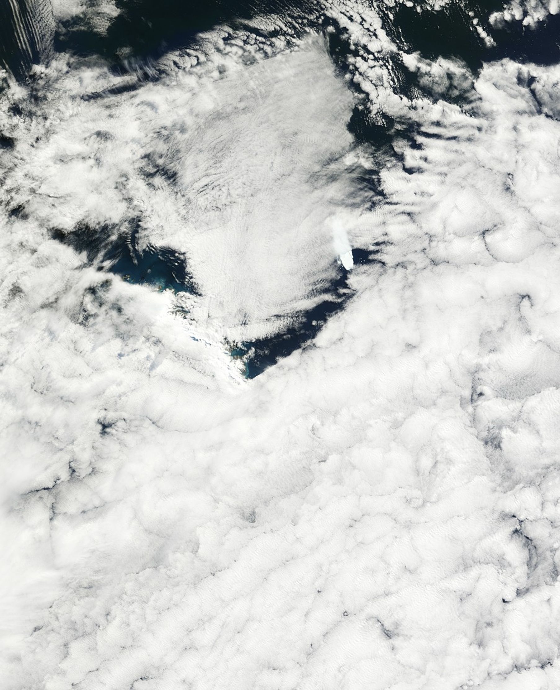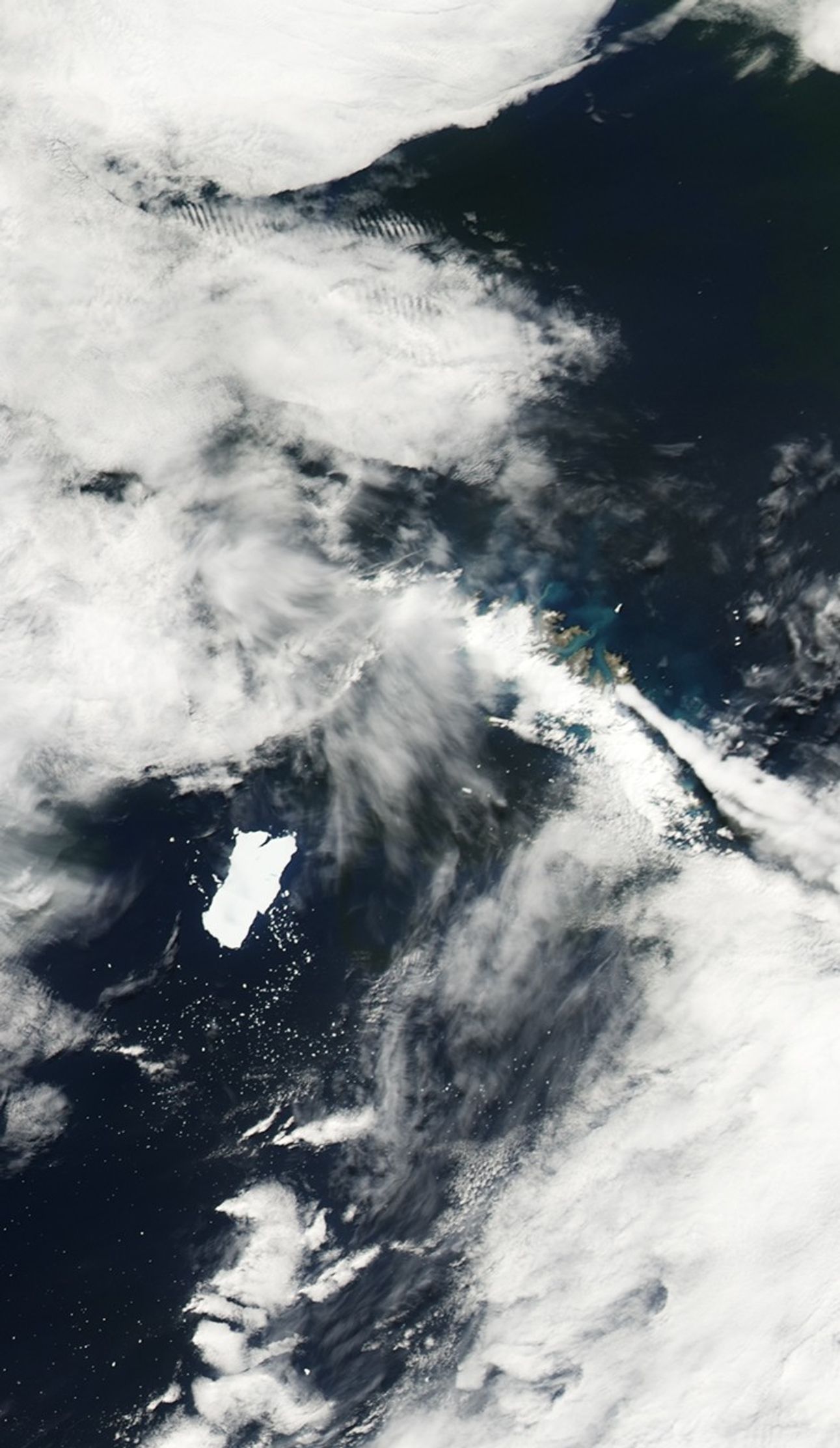 In the January 15 image, the iceberg remains intact, although isolated pale blue melt ponds appear on the surface. These melt ponds are more conspicuous in an astronaut photograph, providing a foreshortened view of the iceberg, also taken on January 15. Melt ponds on the surface of the iceberg suggest that the iceberg may be approaching disintegration. Melt ponds contribute to disintegration because water can fill preexisting cracks on the iceberg’s surface and eventually carve all the way through the ice.