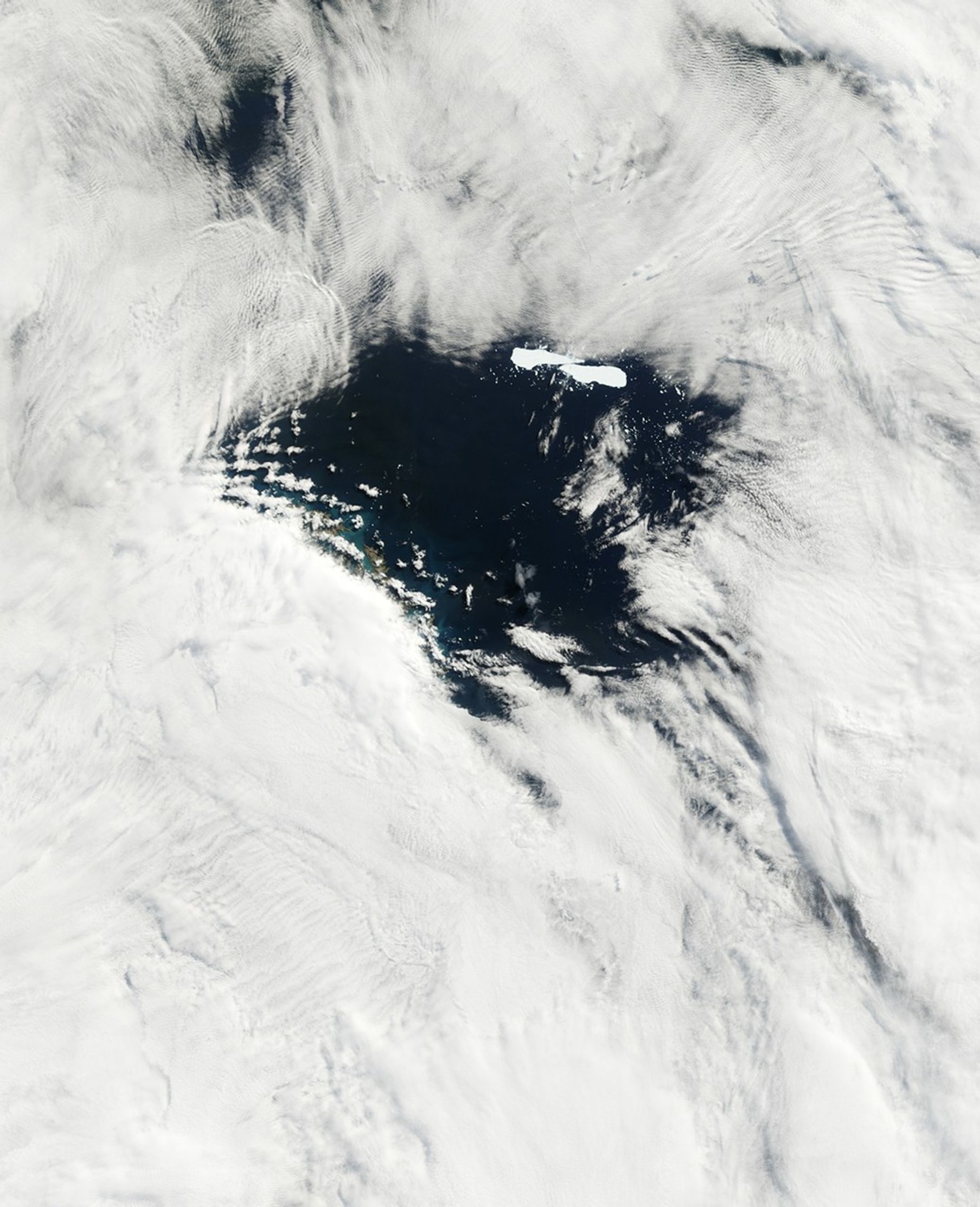 In the January 15 image, the iceberg remains intact, although isolated pale blue melt ponds appear on the surface. These melt ponds are more conspicuous in an astronaut photograph, providing a foreshortened view of the iceberg, also taken on January 15. Melt ponds on the surface of the iceberg suggest that the iceberg may be approaching disintegration. Melt ponds contribute to disintegration because water can fill preexisting cracks on the iceberg’s surface and eventually carve all the way through the ice.