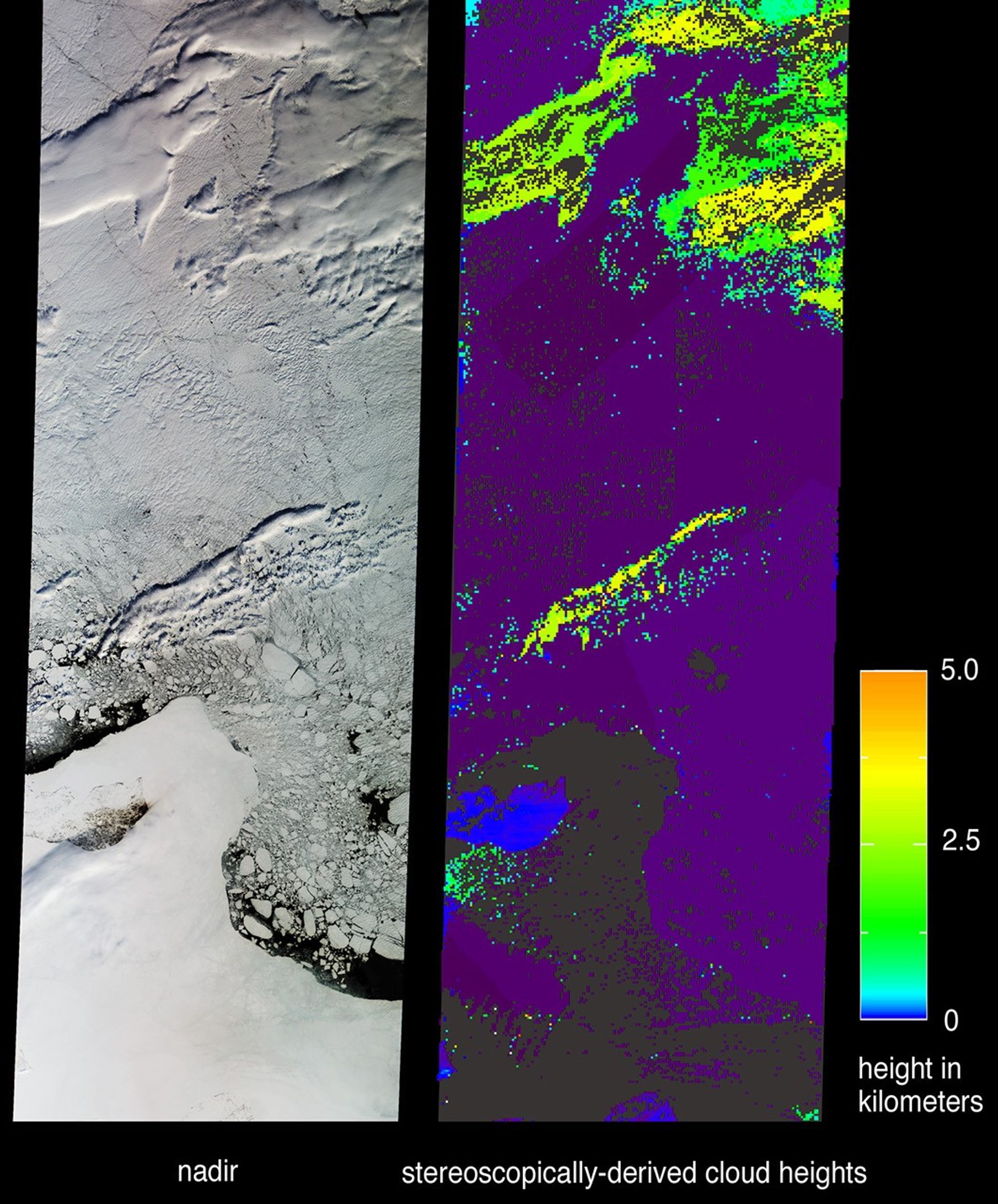 The left-hand image is a natural color view from MISR’s nadir camera. On theright is a height field retrieved using automated computer processing of datafrom multiple MISR cameras. Although both clouds and ice appear white in thenatural color view, the stereoscopic retrievals are able to identify elevatedclouds based on the geometric parallax which results when they are observed fromdifferent angles. Owing to their elevation above sea level, clouds are mapped asgreen and yellow areas, whereas land, sea ice, and very low clouds appear blueand purple. Purple, in particular, denotes elevations very close to sea level.The island of Novaya Sibir is located in the lower left of the images. It can beidentified in the natural color view as the dark area surrounded by an expanseof fast ice. In the stereo map the island appears as a blue region indicatingits elevation of less than 100 meters above sea level. Areas where the automatedstereo processing failed due to lack of sufficient spatial contrast are shown indark gray. The northern edge of the Siberian mainland can be found at the verybottom of the panels, and is located a little over 250 kilometers south ofNovaya Sibir. Pack ice containing numerous fragmented ice floes surrounds thefast ice, and narrow areas of open ocean are visible.