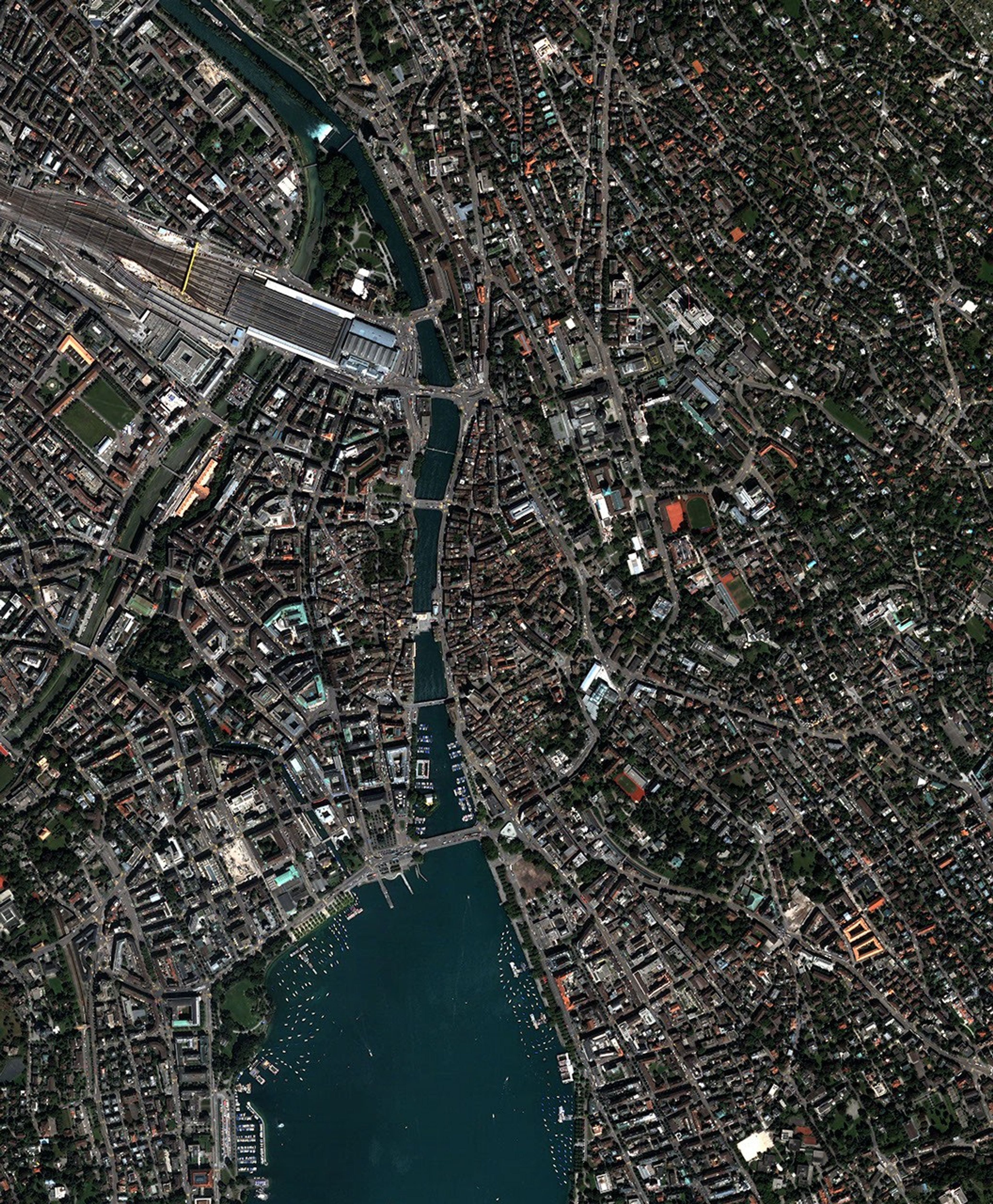 This satellite image displays the city of Zürich, located in the german-speaking part of Switzerland. It was acquired by the Quickbird satellite on August 16, 2002, and was pan-sharpened to an amazing ground resolution (level of detail) of 60 centimeters per pixel.