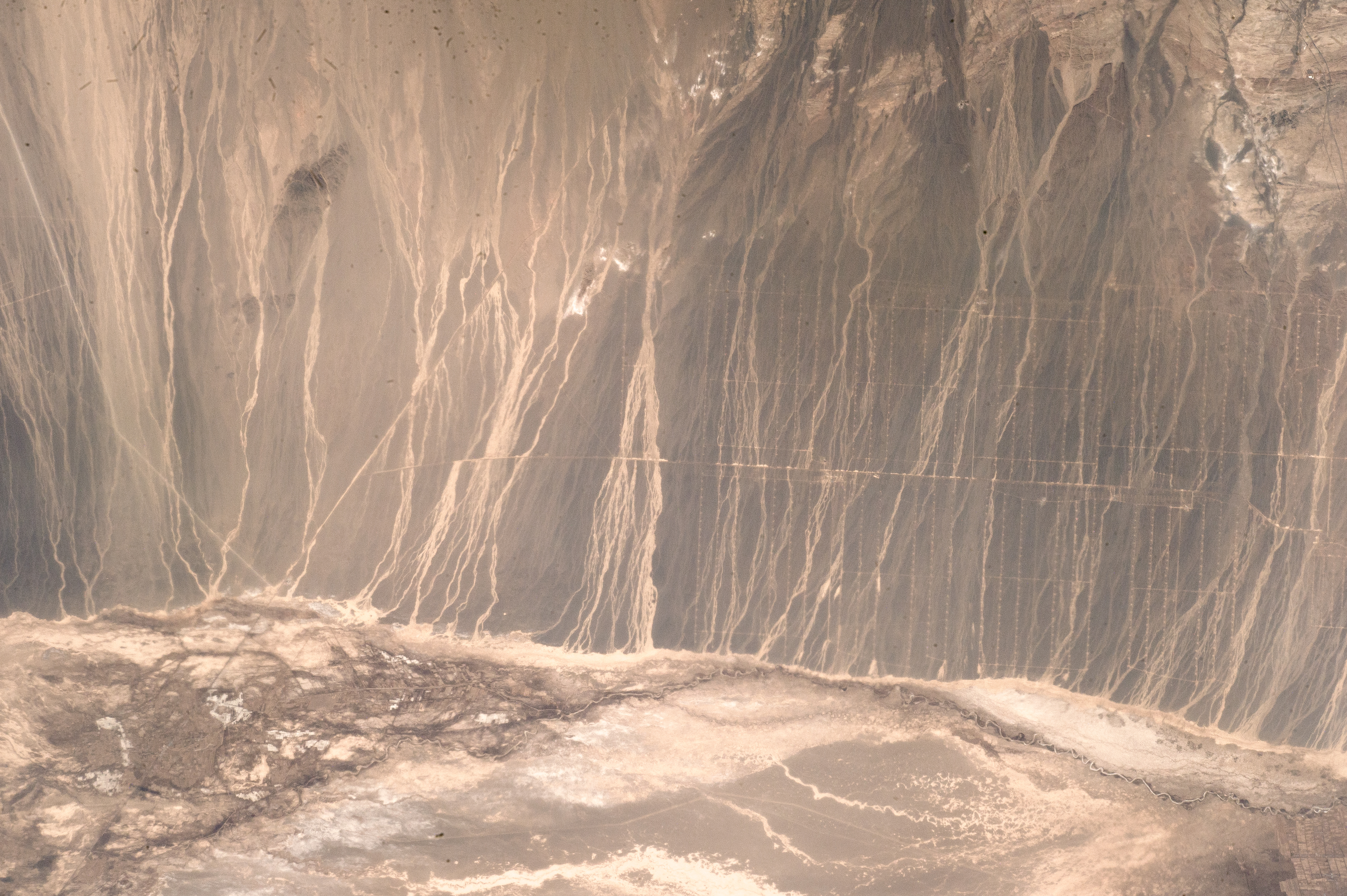An astronaut aboard the International Space Station captured this photograph of drainage patterns on the southwestern end of the Gobi Desert in China’s Gansu Province. The desert landscape—part of the Hexi (or Gansu) Corridor route along the historical Silk Road—is low in elevation, generally flat, and surrounded by mountains and rolling hills.