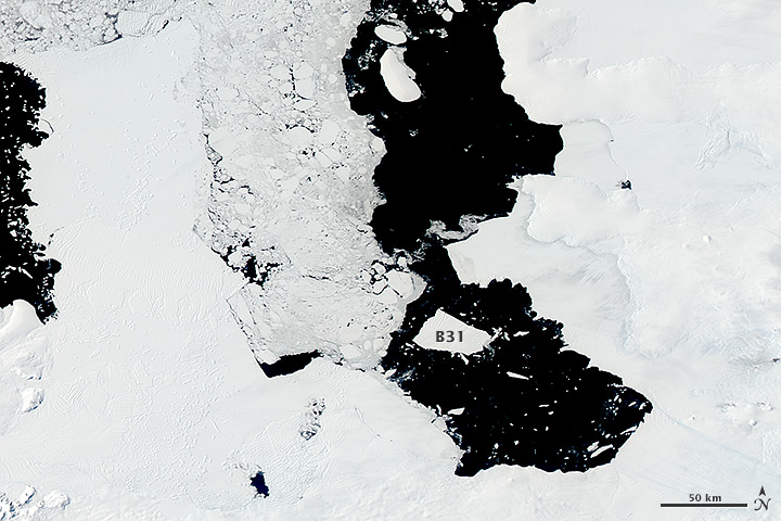 Over the course of five months in Antarctic spring and summer, the Moderate Resolution Imaging Spectroradiometer (MODIS)—an instrument on NASA’s Terra and Aqua satellites—captured a series of images of ice island B31. On this page, Terra captured the image from November 18 and December 10, 2013; while Aura acquired those from February 5 and March 11, 2014. The time-lapse video below shows the motion of the massive chunk of ice.