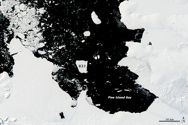 In early November 2013, a large iceberg separated from the front of Antarctica’s Pine Island Glacier. It thus began a journey across Pine Island Bay, a basin of the Amundsen Sea. The ice island, named B31, will likely be swept up soon in the swift currents of the Southern Ocean, though it will be hard to track visually for the next six months as Antarctica heads into winter darkness.