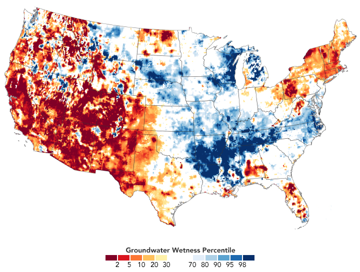 The map below shows shallow groundwater storage as of March 29, 2021, as measured by the GRACE-FO satellites. The colors depict how the amount of groundwater compares to long-term records (1948-2010). Groundwater in aquifers is an important resource for crop irrigation and drinking water, and it also can sustain streams during dry periods. Groundwater takes months to rebound from drought, though, as it has to be slowly and steadily replenished by surface moisture that seeps down through soil and rock to the water table.