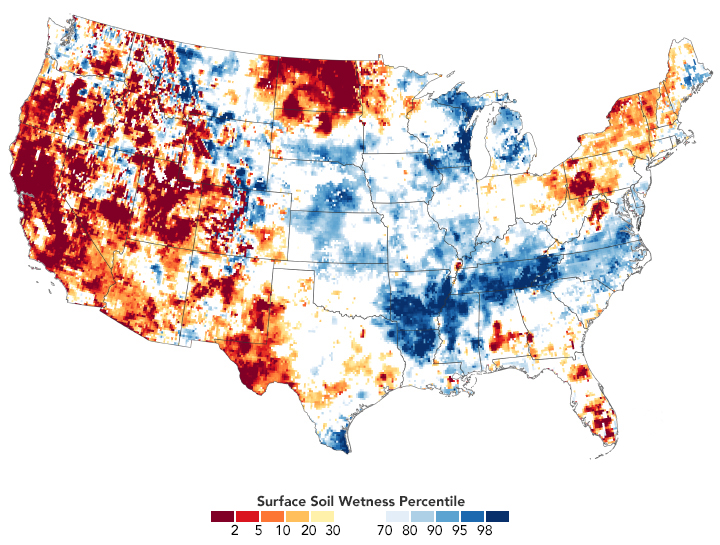 The map below shows surface soil moisture as of March 29, 2021, as measured by the Gravity Recovery and Climate Experiment Follow-On (GRACE-FO) satellites. The colors depict the wetness percentile; that is, how the levels of soil moisture compare to long-term records for the month. Blue areas have more abundant water than usual, and orange and red areas have less. The darkest reds represent dry conditions that should occur only 2 percent of the time (about once every 50 years).