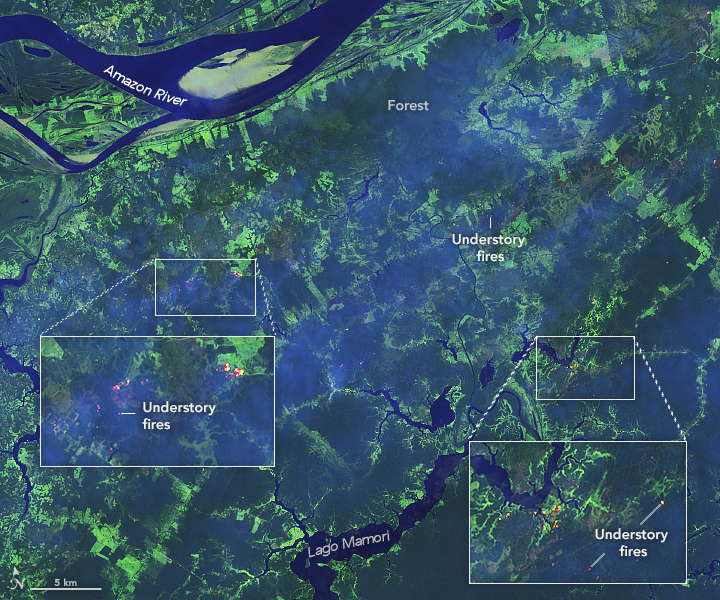 It is possible to identify some understory forest fires with the VIIRS (Visible Infrared Imaging Radiometer Suite) sensors on the Suomi NPP and NOAA-20 satellites, but it’s challenging for satellites to detect all of them because they often burn beneath dense canopy. Sensors on Landsat 8 and 9 and the Sentinel-2 satellites offer more detailed observations than VIIRS and can sometimes detect understory fires, though they pass over the Amazon basin less frequently than VIIRS.