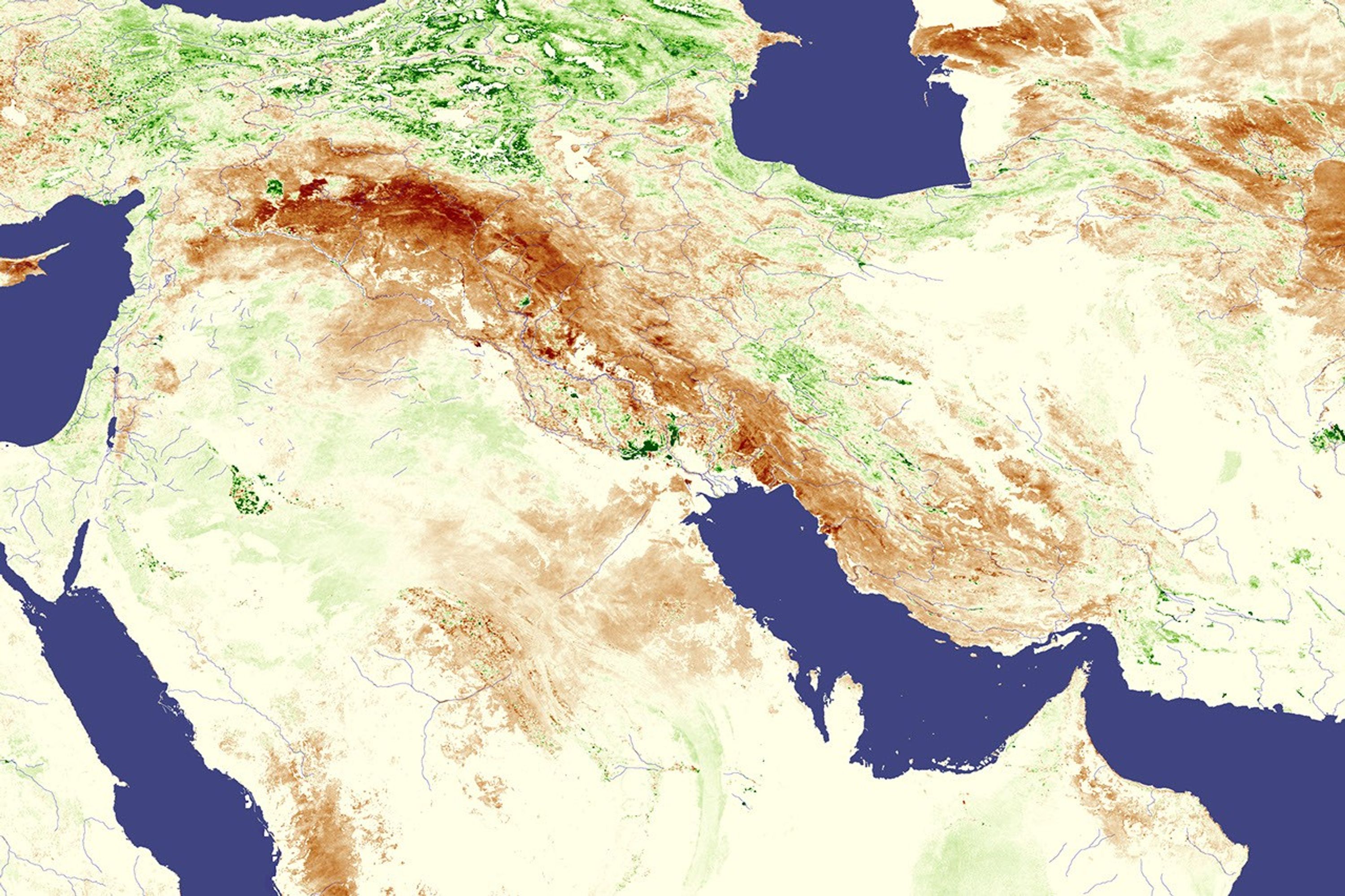 Crop analysts at the Foreign Agricultural Service use satellite imagery such as this vegetation image along with field reports to track crop conditions around the world. Made from data collected by France’s SPOT Vegetation satellite in April 2008, this image shows how plants were growing compared to a long-term average. The arc of deep brown that stretches over the Fertile Crescent region indicates that plants were more sparse or less healthy than average in April 2008. Irrigated farmland stands out as bright green spots surrounded by the brown or white that represents rain-fed vegetation. For a closer view of the contrast between irrigated and rain-fed crops, see the MODIS image of northern Syria and Iraq.