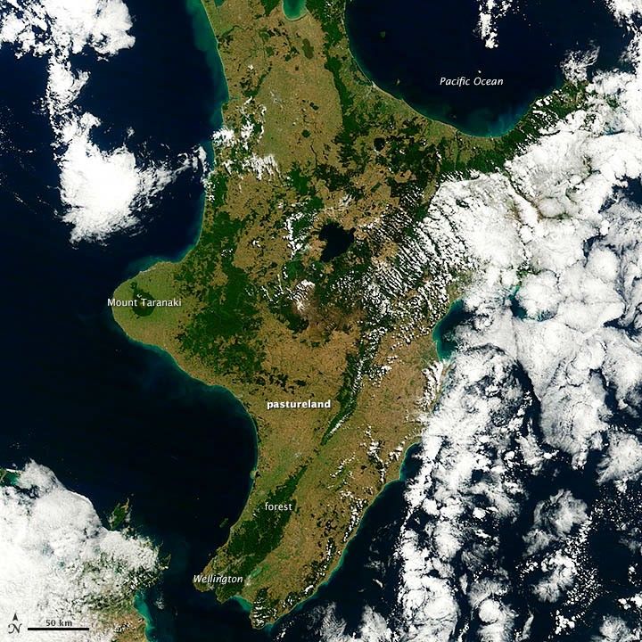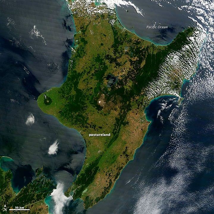 A significant portion of North Island is comprised of grassland that farmers used as pastureland. Most of the pasturelands are not irrigated and depend on rainfall. The Moderate Resolution Imaging Spectroradiometer (MODIS) on NASA’s Terra satellite captured these glimpses of the drought’s impact. The landscape in the top image, acquired on April 10, 2013, was considerably browner than in April 2009 (a more typical year). The light green areas, where changes are most noticeable, are mainly pastoral landscapes populated by sheep, cattle, and deer farmers. The darker areas without significant changes in greenness are forests.