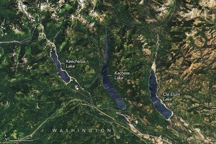 Water storage in the basin’s five reservoirs has dropped sharply as well, bringing levels, at times, to some of the lowest measured since record-keeping started in 1971. The OLI (Operational Land Imager) on Landsat 8 captured this image (above right) of three of the Yakima basin reservoirs on July 29, 2025, the most recent date a clear image of the reservoirs was available.