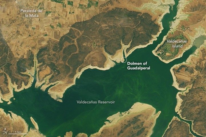 In 1963, the Spanish government under Francisco Franco built the Valdecañas Reservoir in order to bring water and electricity to underdeveloped parts of western Spain. However, the creation of the reservoir flooded some inhabited areas as well as large stone (megalithic) monuments. After fifty years underwater, one of these ancient monuments—the Dolmen of Guadalperal—resurfaced due to dry, hot conditions in 2019.