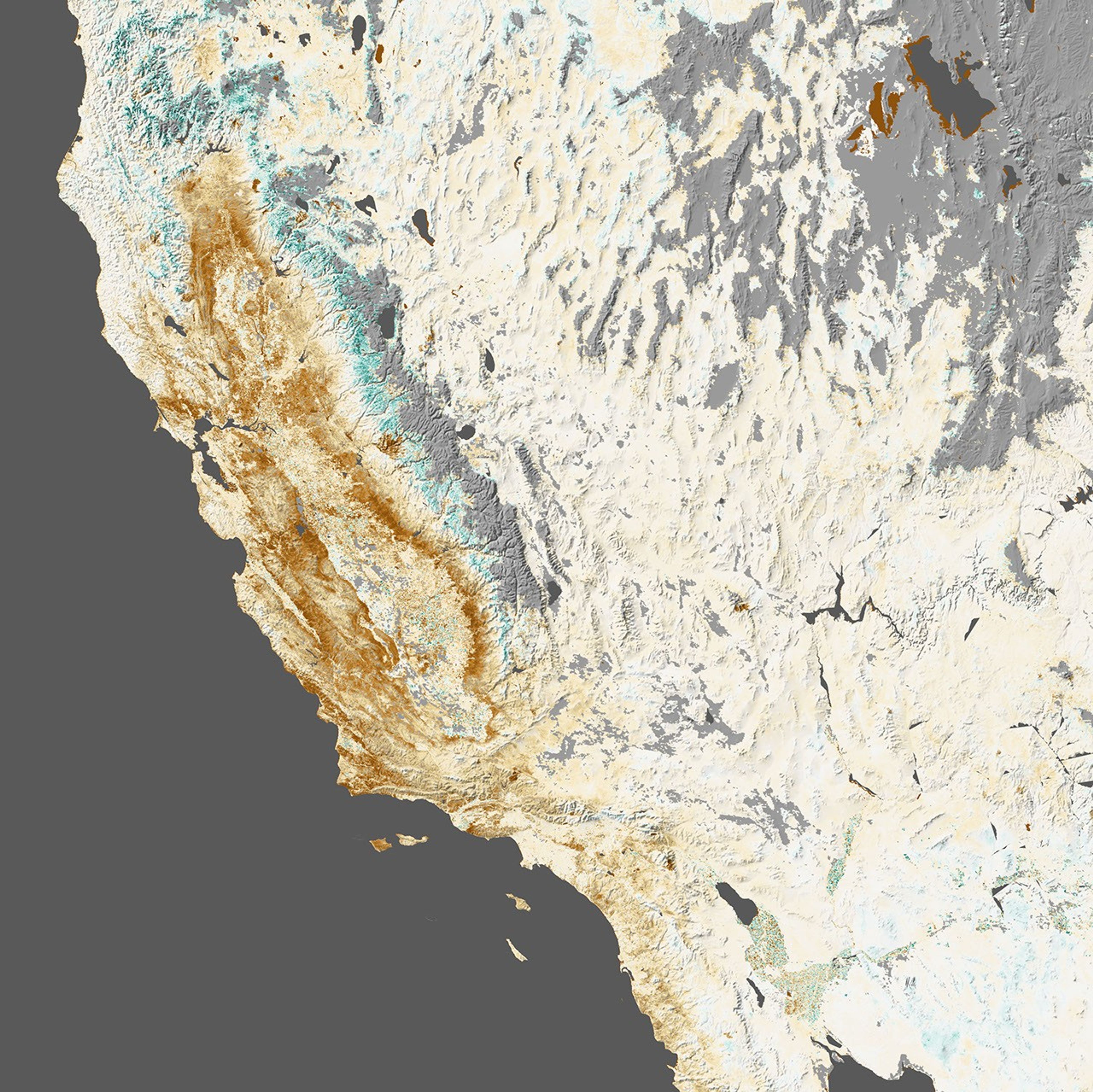There is some surprising greenness along the edges of the Sierra Nevada range. “In a normal year, much of the green areas near the mountains would be snow-covered,” said Ramakrishna Nemani, a vegetation sensing expert at NASA’s Ames Research Center. “Since there is not much snow this year, the evergreen vegetation appears anomalously green. In fact, that is bad news for this time of the year.”