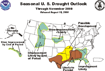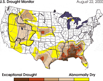 A sophisticated system for measuring drought was developed by National Weather Service meteorologist Wayne Palmer in 1965. Now called the Palmer Drought Severity Index (PDSI), it uses temperature and rainfall information in a formula to determine dryness and has become the semi-official drought index. The PDSI is most effective in determining long-term drought–a matter of several months–and is not as effective with short-term forecasts (a matter of weeks). It uses a 0 as normal, and drought is shown in terms of negative numbers; for example, -2 is moderate drought, -3 is severe drought, and -4 is extreme drought. In mid August 2000, sections of many western states were in the -4 range.