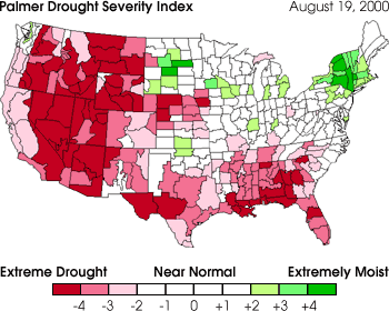 A sophisticated system for measuring drought was developed by National Weather Service meteorologist Wayne Palmer in 1965. Now called the Palmer Drought Severity Index (PDSI), it uses temperature and rainfall information in a formula to determine dryness and has become the semi-official drought index. The PDSI is most effective in determining long-term drought–a matter of several months–and is not as effective with short-term forecasts (a matter of weeks). It uses a 0 as normal, and drought is shown in terms of negative numbers; for example, -2 is moderate drought, -3 is severe drought, and -4 is extreme drought. In mid August 2000, sections of many western states were in the -4 range.