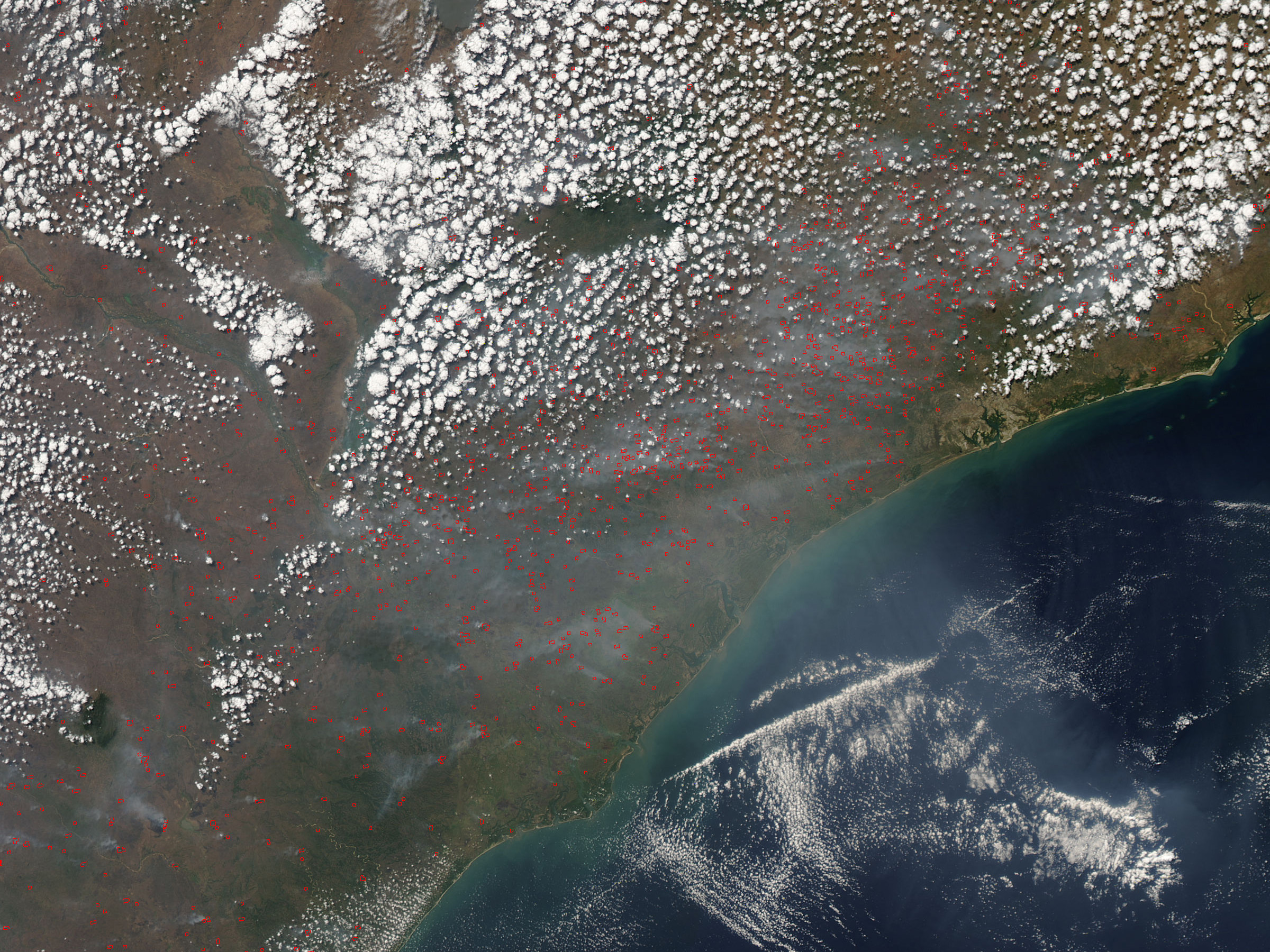 The climate of Mozambique is dominated by a wet (November-April) and dry (May-October) monsoon. Fires increase in number, size, and intensity as the dry season progresses. A small number of fires start naturally, but people start the majority of fires either intentionally for agricultural purposes or accidentally. This Moderate Resolution Imaging Spectroradiometer (MODIS) image of coastal Mozambique on August 16, 2005, shows hundreds of fires (marked in red) that were detected by MODIS as it passed overhead. Though intentional agricultural fires are not necessarily immediately hazardous, they can have strong negative impacts on human health and natural resources.