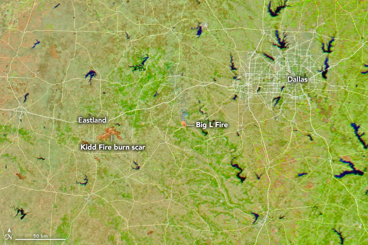 About 125 miles west of Dallas, the Kidd Fire ignited on March 17 amid days of strong, dry winds. (This short time-lapse sequence shows dust and clouds caught up in the winds.) More than 42,000 acres (65 square miles) have burned so far in a fire that is about 40 percent contained. At least 147 homes and structures have been consumed, including most of the town of Carbon. The Kidd Fire is one of seven that have been grouped into the Eastland Complex by firefighting agencies; more than 54,000 acres (84 square miles) of wildland and property have burned near the town of Eastland.