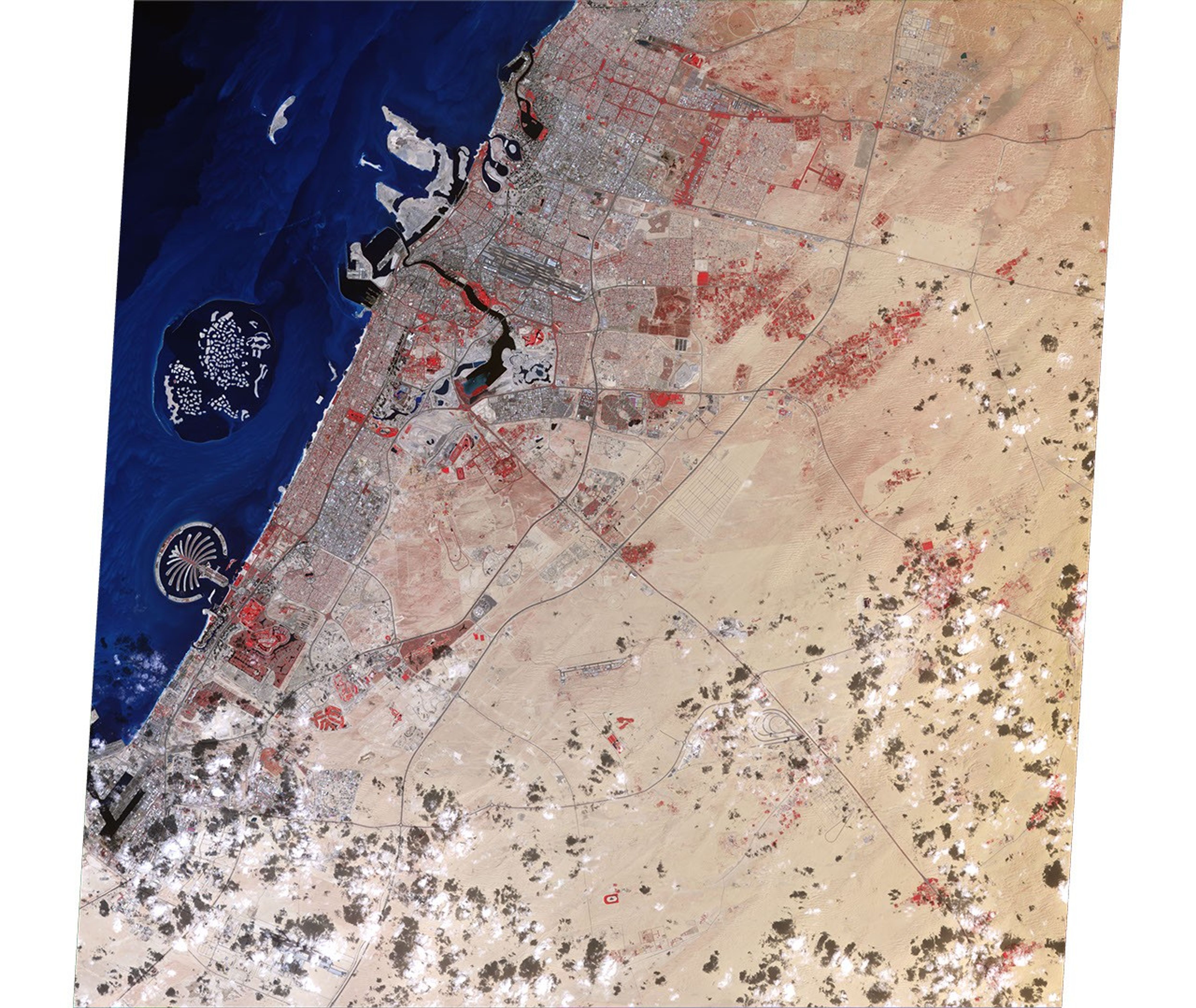 The Advanced Spaceborne Thermal Emission and Reflection Radiometer (ASTER) on NASA’s Terra satellite captured this false-color image of part of Dubai, including the resort island of Palm Jumeirah, on February 8, 2010. Bare ground appears brown, vegetation appears red, water appears dark blue, and buildings and paved surfaces appear light blue or gray. This image is part of the Earth Observatory’s World of Change feature Urbanization of Dubai.