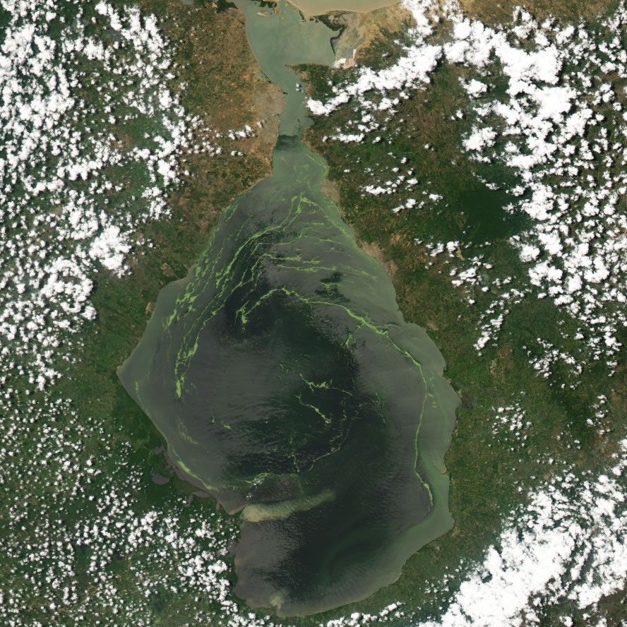 Regardless of how the plant arrived, it is thriving on the lake. In the above image, duckweed covers 18 percent of the 13,280-square-kilometer lake, according to Acosta’s analysis. In the best (or worst) of conditions, duckweed can double in size in two days. The only way to remove the weed is to pull it out of the lake physically, says Acosta. No chemical or biological method has been found to treat the weed. The removal process has proven to be particularly difficult in the center of the lake where a specially equipped ship may be needed to pull the weed off the lake. More likely, however, the weed will simply run out of nutrients and the outbreak will die down on its own.