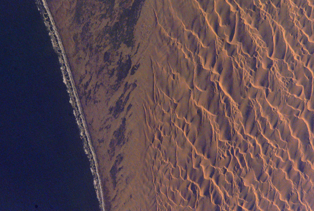 This detailed view of the remote Conception Bay sector of the Namibian coastline shows breakers and a strand plain on the left and complex dunes of the Namib dune sea on the right. A strand plain is a series of dunes, usually associated with and parallel to a beach, sometimes containing small creeks or lakes. The complexity and regularity of dune patterns in the dune sea of the Namib Desert have attracted the attention of geologists for decades; however, they remain poorly understood. The flat strand plain (~4 kilometers shown here) shows a series of wet zones that appear black where seawater seeps inland and evaporates. These patches are aligned with the persistent southerly winds, some of the strongest of any coastal desert.