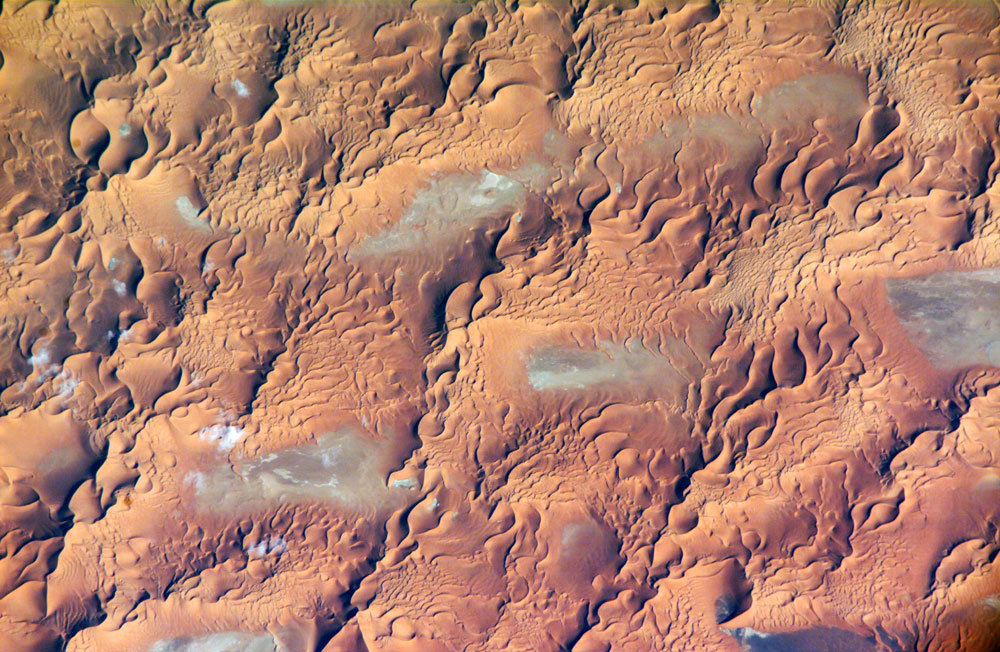In this image, the mega-dunes appear as big, rolling lumps that zigzag toward the upper right. The “streets” between these biggest dune chains have been swept clean of sand in places, showing their original surfaces of pale mud and salts. The pale beige-grey of these areas contrasts with the otherwise burnt orange hues. Mesoscale dunes, some of which form octopus-like crests, or star dunes, mark the backs of the mega-dunes. The smallest dunes appear in patches on the eastern sides of the mega-dunes as a tracery of closely spaced crests. Interestingly, the crest orientation of the small dunes differs from the orientation of the mesoscale dunes. This difference is a common effect of local shifts in wind direction, which is influenced by dune height.