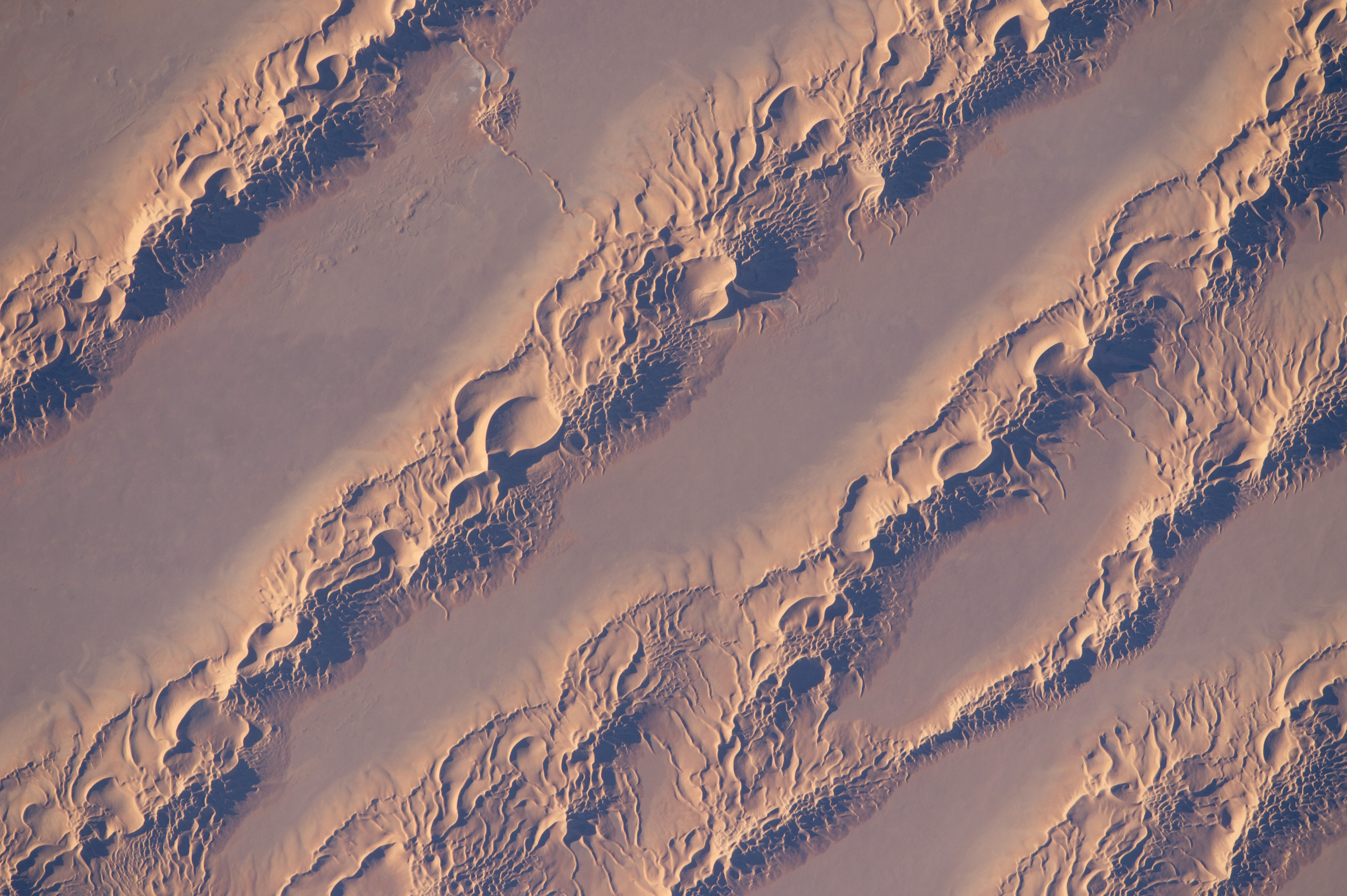 Looking almost straight down onto the Sahara Desert, a crew member aboard the International Space Station took this late afternoon photograph of the Grand Erg Oriental. Astronauts have a unique vantage point from which to view the large areas of Algeria and Libya covered by seas of sand.