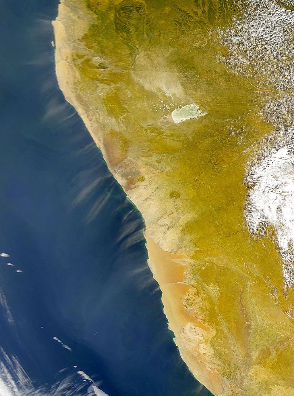 The Sea-viewing Wide field-of-view Sensor (SeaWiFS) captured thistrue color scene of dust streaming from thedeserts along the southwestern coast of Africainto the Atlantic ocean on June 6, 2000.