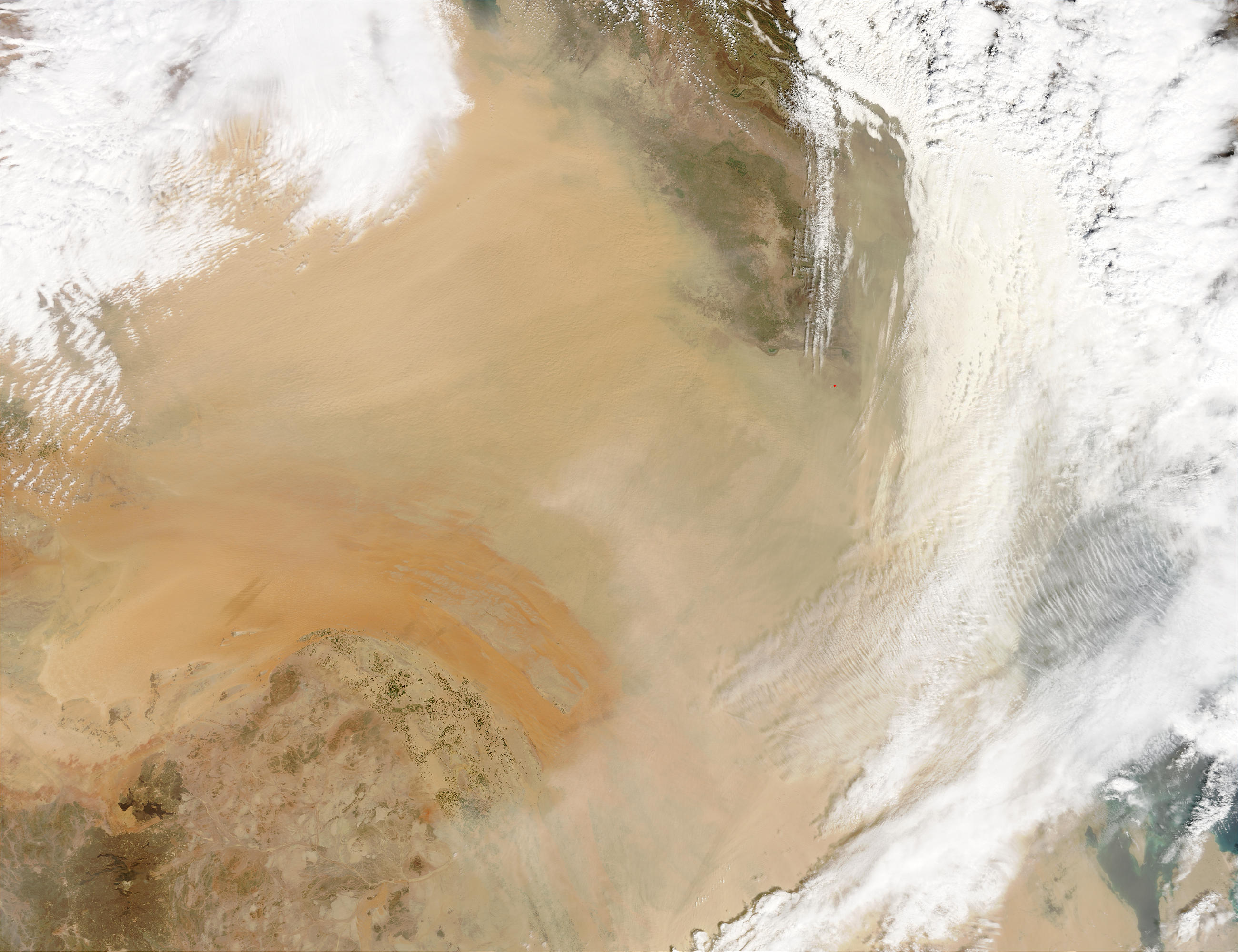 Between two banks of clouds, a huge sandstorm can be seen blowing over Iraq and parts of Saudi Arabia in this true-color Moderate Resolution Imaging Spectroradiometer (MODIS) image from Terra satellite on the morning of March 26, 2003. Waves of airborne sand and dust were breaking over Iraq. At right, dust mingles with the clouds, and in the top half of the image, dust shrouds the dark green vegetation of the Fertile Crescent, between the Tigris and Euphrates Rivers.
