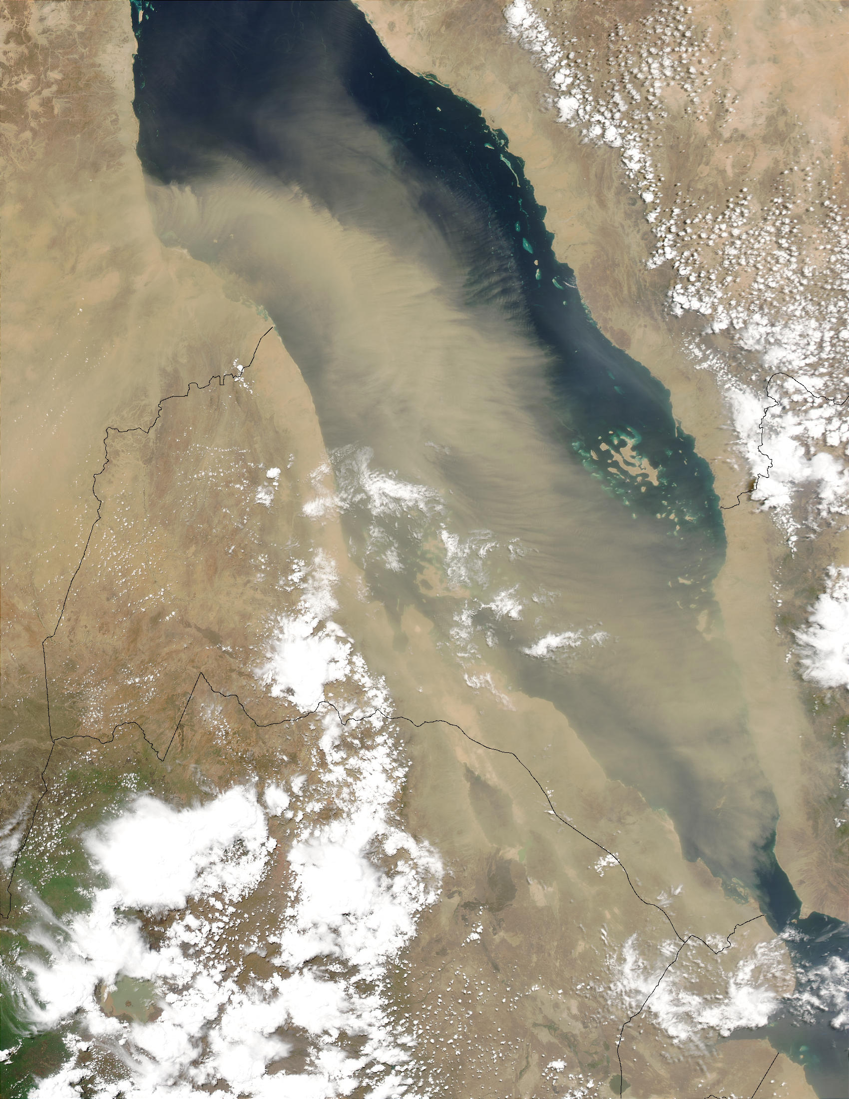An immense dust storm was blowing over the Red Sea from East Africa on June 21, 2003. This Moderate Resolution Imaging Spectroradiometer (MODIS) image from the Aqua satellite shows a thick cloud of desert dust shrouding (top left to bottom) Sudan, Eritrea, Ethiopia, and Djibouti. The thick plume stretches across the Red Sea (center) and breaks like a wave across the shores of Saudi Arabia and Yemen (top and bottom right).