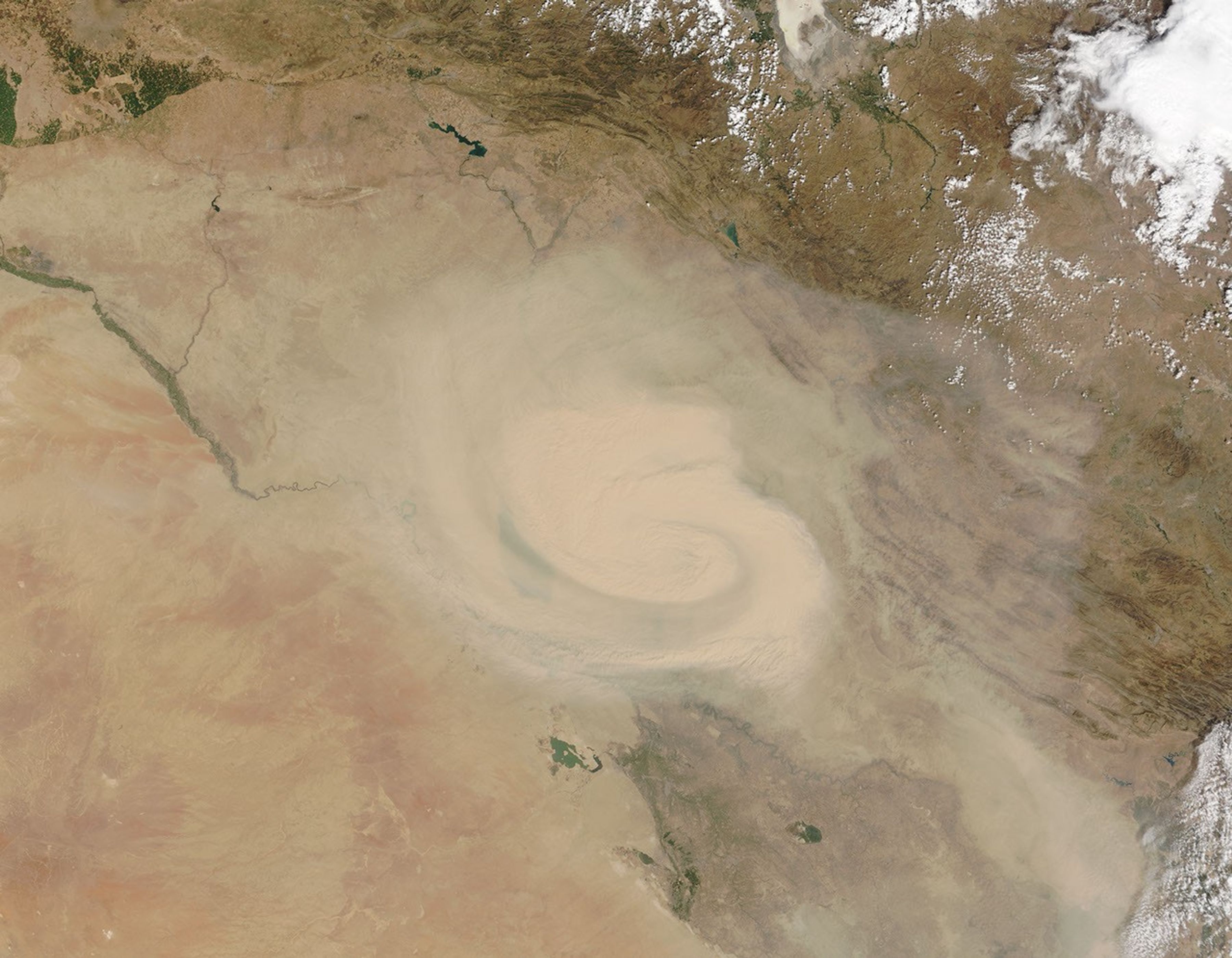 Dust and sand storms in the Middle East and other arid regions tend to come in two forms. Haboobs are dramatic events associated with storm fronts and often appear as walls of sand and dust marching across the landscape. But like thunderstorms, haboobs tend to abrupt and short-lived. Then there are the long-lived, wide-reaching dust storms that can last for days. In Iraq, such storms are often associated with the shamal, a pattern of persistent northwesterly winds.