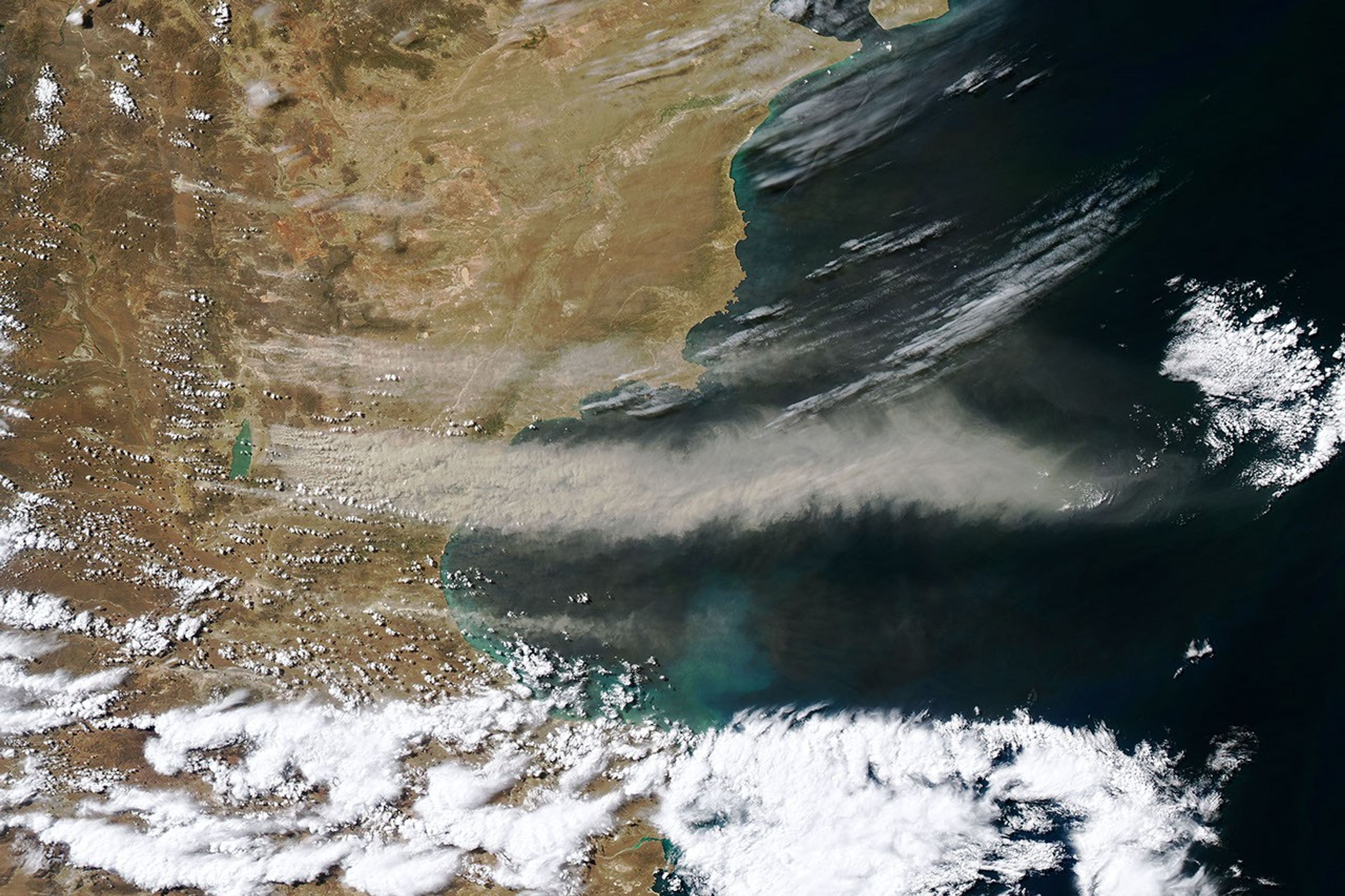 South America is no stranger to dust storms. In Argentina, an abundance of fine sediment has caused many events in the last few years large enough to be recorded by satellites. Here, the dust blows east toward the Atlantic Ocean.